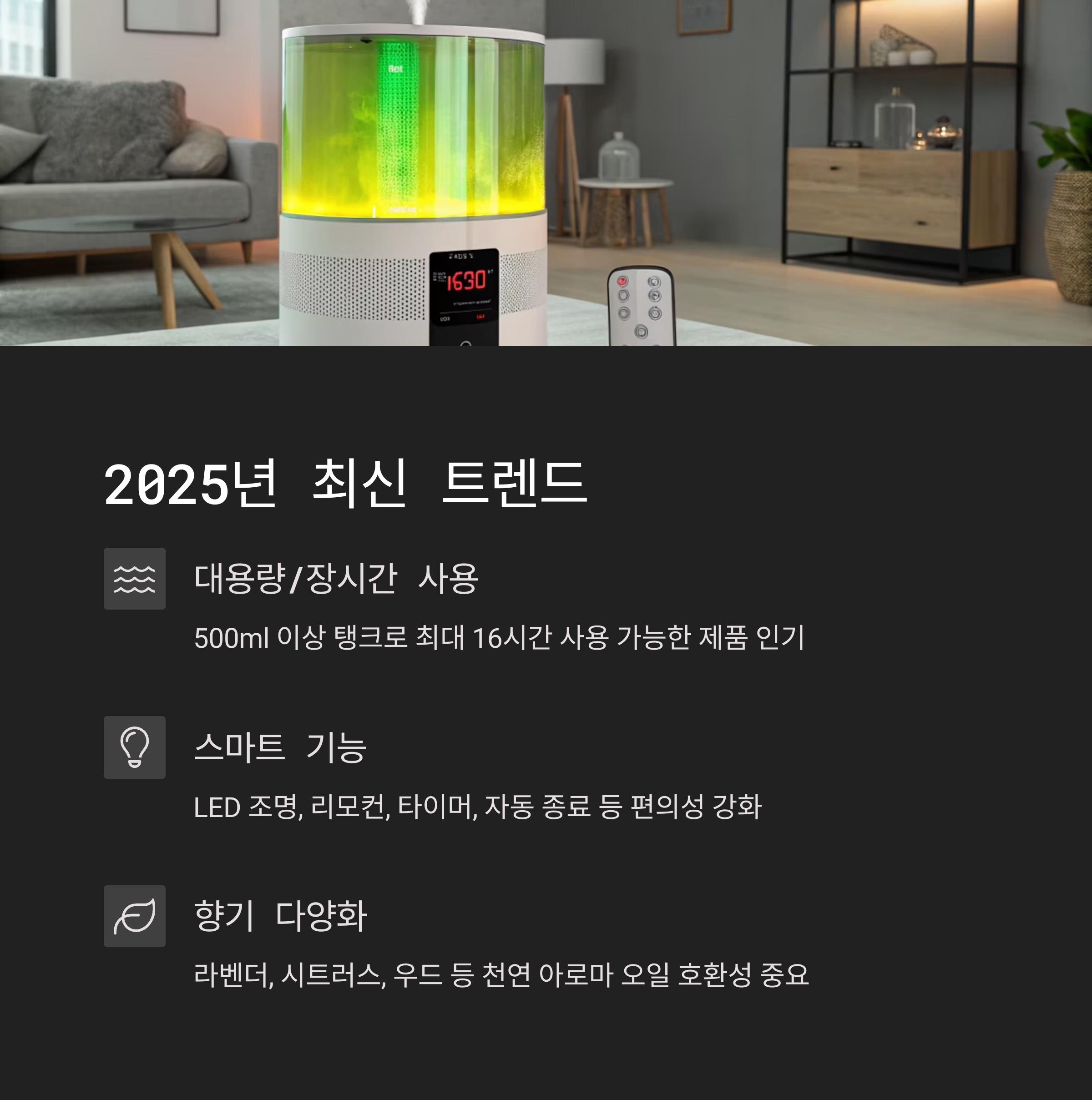- 향기 선택 다양화: 라벤더, 시트러스, 우드 등 천연 아로마 오일과의 호환성이 강조되고 있습니다.