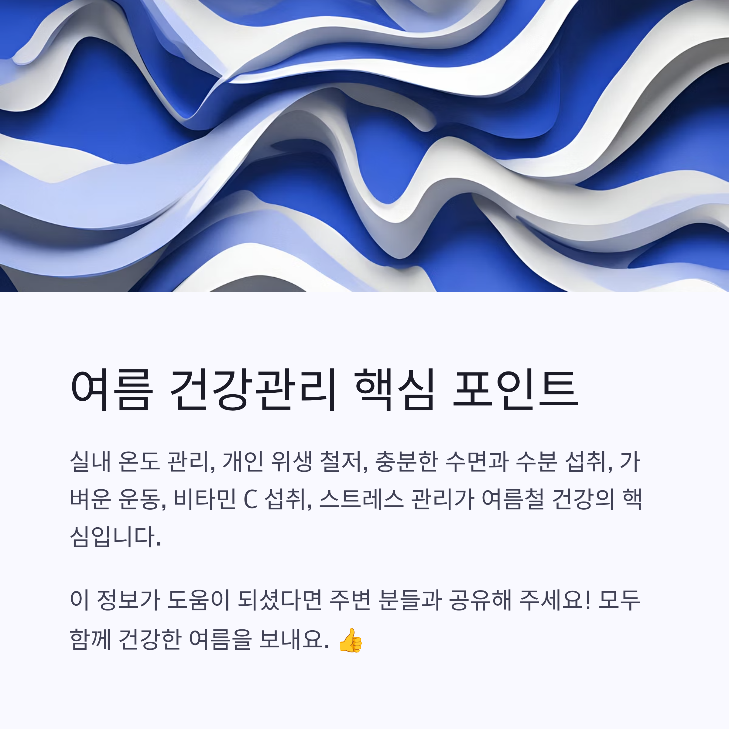 실내 온도 관리, 개인 위생 철저, 충분한 수면과 수분 섭취, 가벼운 운동 및 비타민 C 섭취, 그리고 스트레스 관리와 피부 보호가 여름철 건강을 위한 핵심 포인트입니다. 위 항목들을 철저히 지킨다면, 누구나 건강한 여름을 보낼 수 있습니다.