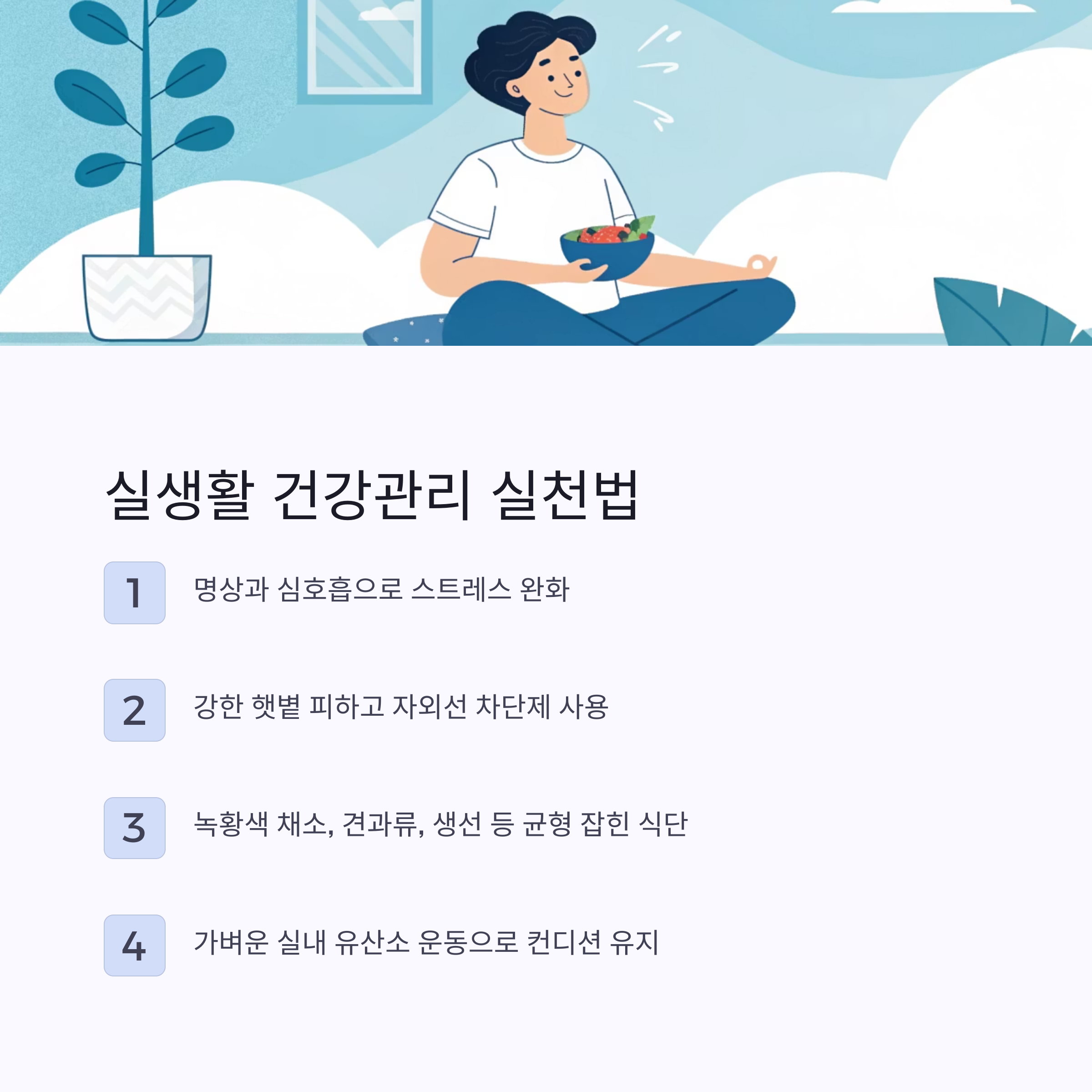 | 균형 식단 | 녹황색 채소, 견과류, 생선 섭취 |