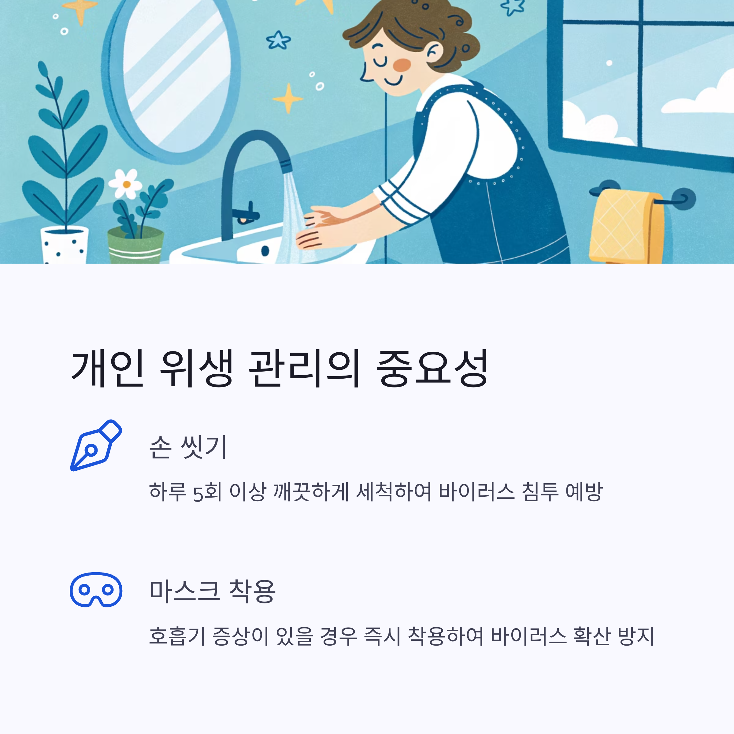 여름철에는 개인 위생 관리가 매우 중요합니다. 외출 후 손과 얼굴 세척은 기본이며, 실내에서도 하루 5회 이상 물로 깨끗하게 세척해 바이러스 침투를 예방해야 합니다. 호흡기 증상이 있는 경우 즉시 마스크를 착용해 바이러스 확산을 막아야 합니다. 위생 관리는 여름 건강관리를 위한 필수 생활 습관입니다.
