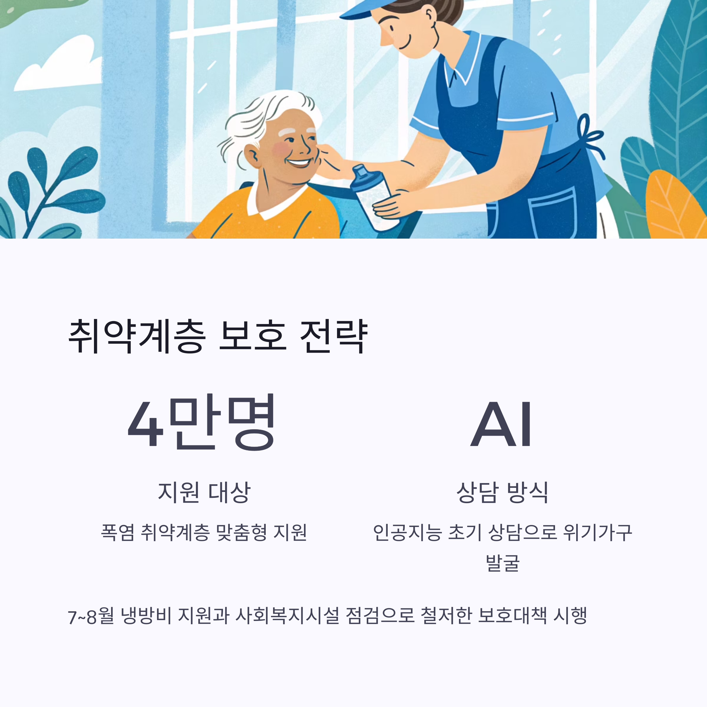 2025년 정부는 빅데이터를 활용하여 여름철 폭염 취약계층 약 4만 명을 대상으로 맞춤형 지원을 제공합니다. 인공지능(AI) 초기 상담을 통해 신속히 복지 위기가구를 찾아 도움을 주고 있으며, 7~8월에는 냉방비 지원과 사회복지시설 점검을 통해 철저한 보호대책을 펼치고 있습니다.