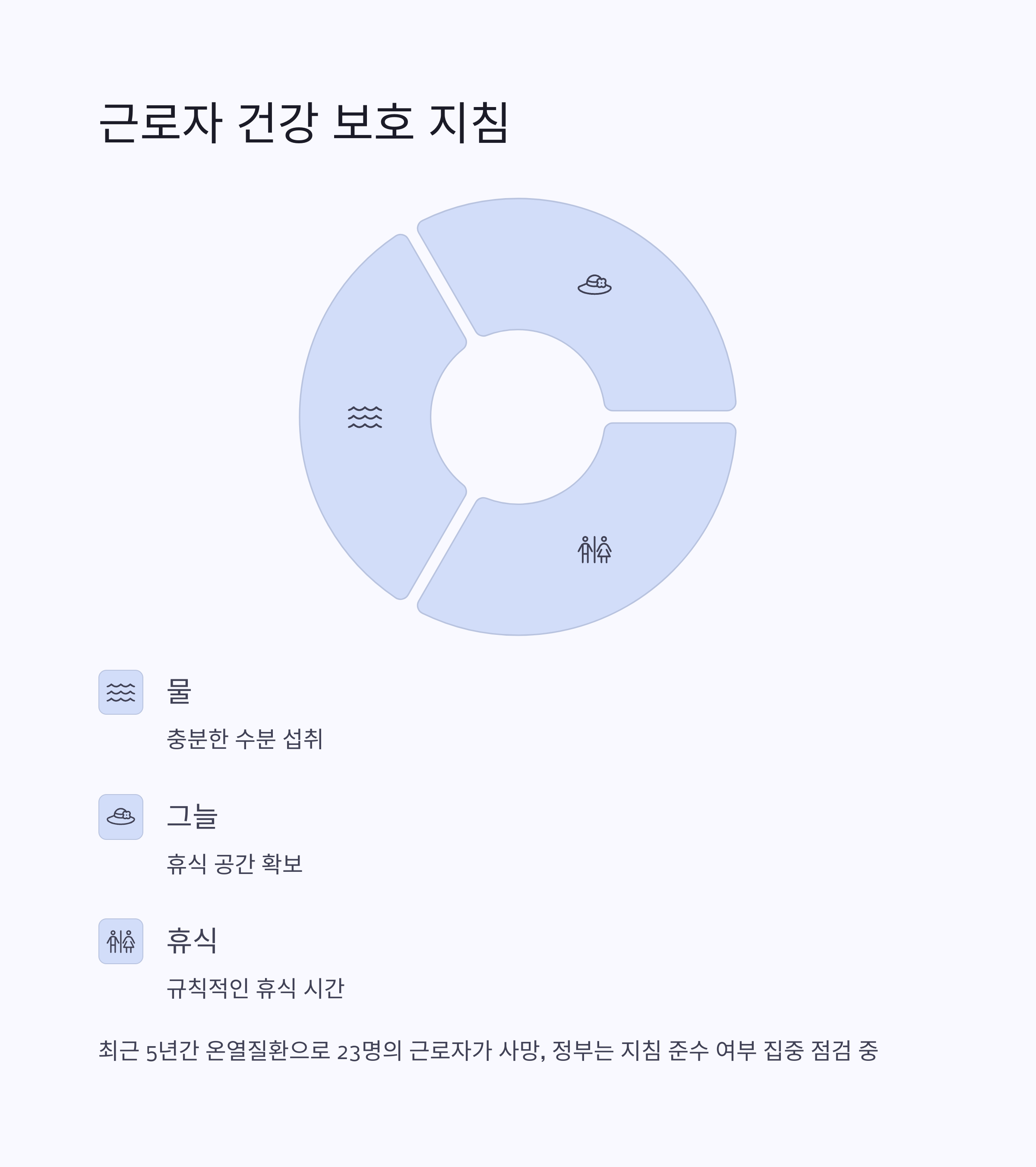 최근 5년간 온열질환으로 인한 근로자 사망자가 23명으로 집계됨에 따라 정부는 근로자 보호에 더욱 적극적입니다. 고용노동부는 실외작업 시 물, 그늘, 휴식 3대 원칙 준수를 강조하고, 실내 작업장은 온도 및 환기 관리를 철저히 하도록 권장하고 있습니다. 정부는 관련 지침 준수 여부를 집중 점검해 근로자 건강 보호에 최선을 다하고 있습니다.
