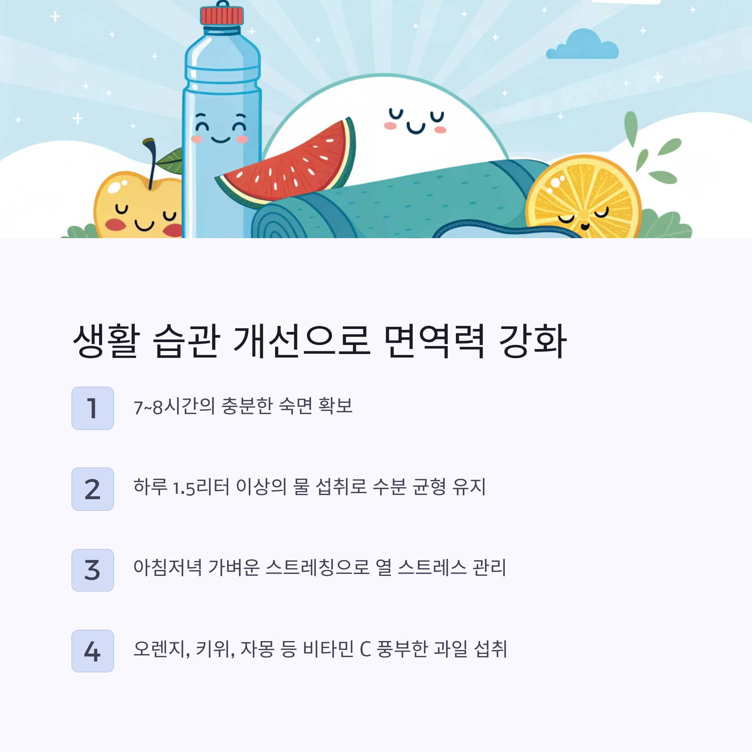 여름철 건강 유지를 위해서는 생활 습관 개선이 중요합니다. 7~8시간의 숙면을 확보하고, 충분한 수분 섭취는 필수입니다. 하루 1.5리터 이상의 물을 마셔 체내 수분 균형을 유지하고, 가벼운 스트레칭을 아침저녁 꾸준히 실시하면 열 스트레스를 효과적으로 관리할 수 있습니다. 또한 비타민 C가 풍부한 과일 섭취도 중요합니다.