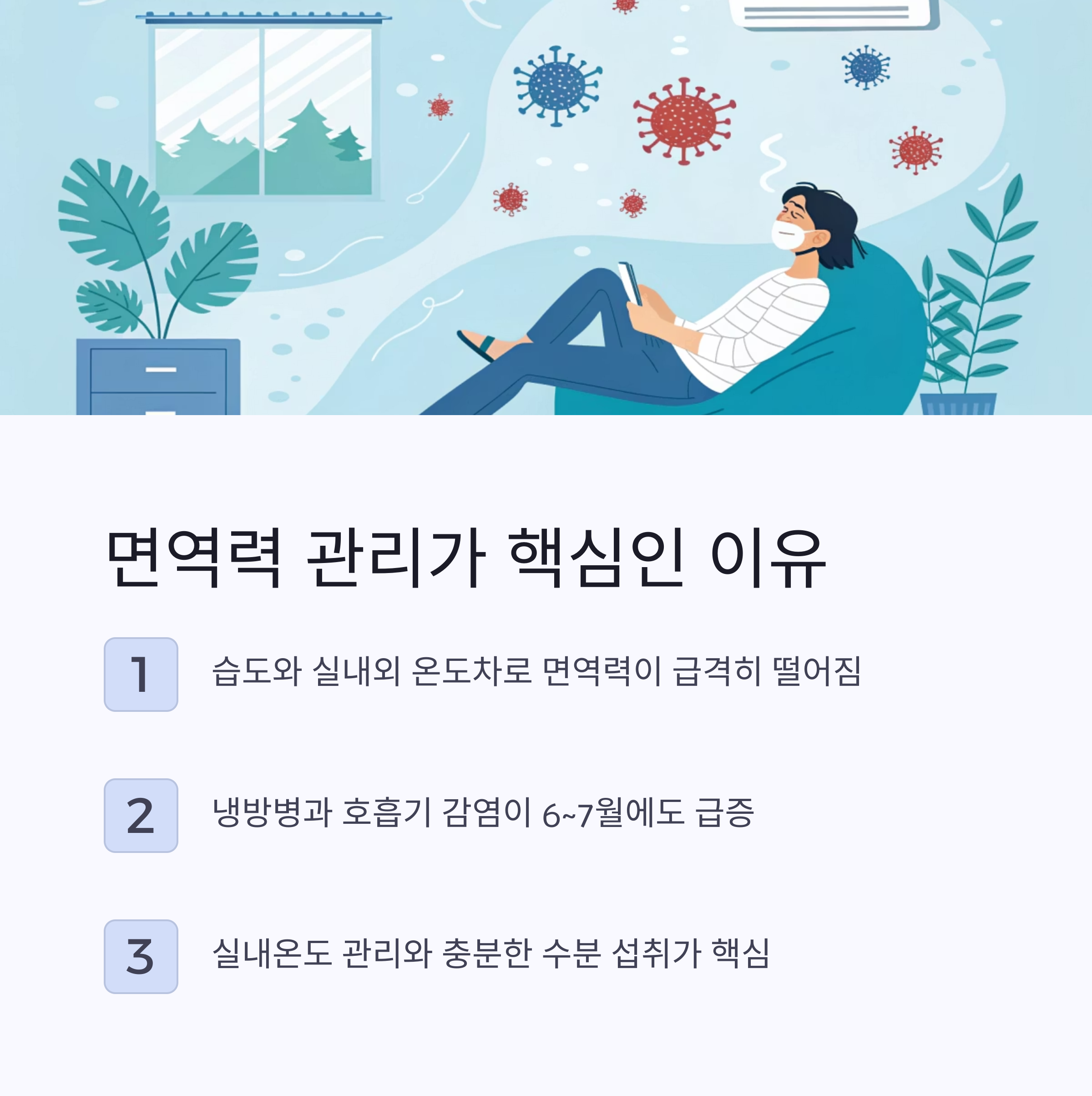 여름철에는 습도와 실내외 큰 온도차로 인해 면역력이 급격히 떨어지기 쉽습니다. 최근 연구 데이터에 따르면, 냉방병과 호흡기 감염이 증가하는 시기가 겨울뿐만 아니라 초여름인 6~7월에도 급증합니다. 여름철 건강을 지키려면 면역력 유지가 필수이며, 이를 위해 실내온도 관리 및 충분한 수분 섭취가 핵심으로 꼽히고 있습니다.