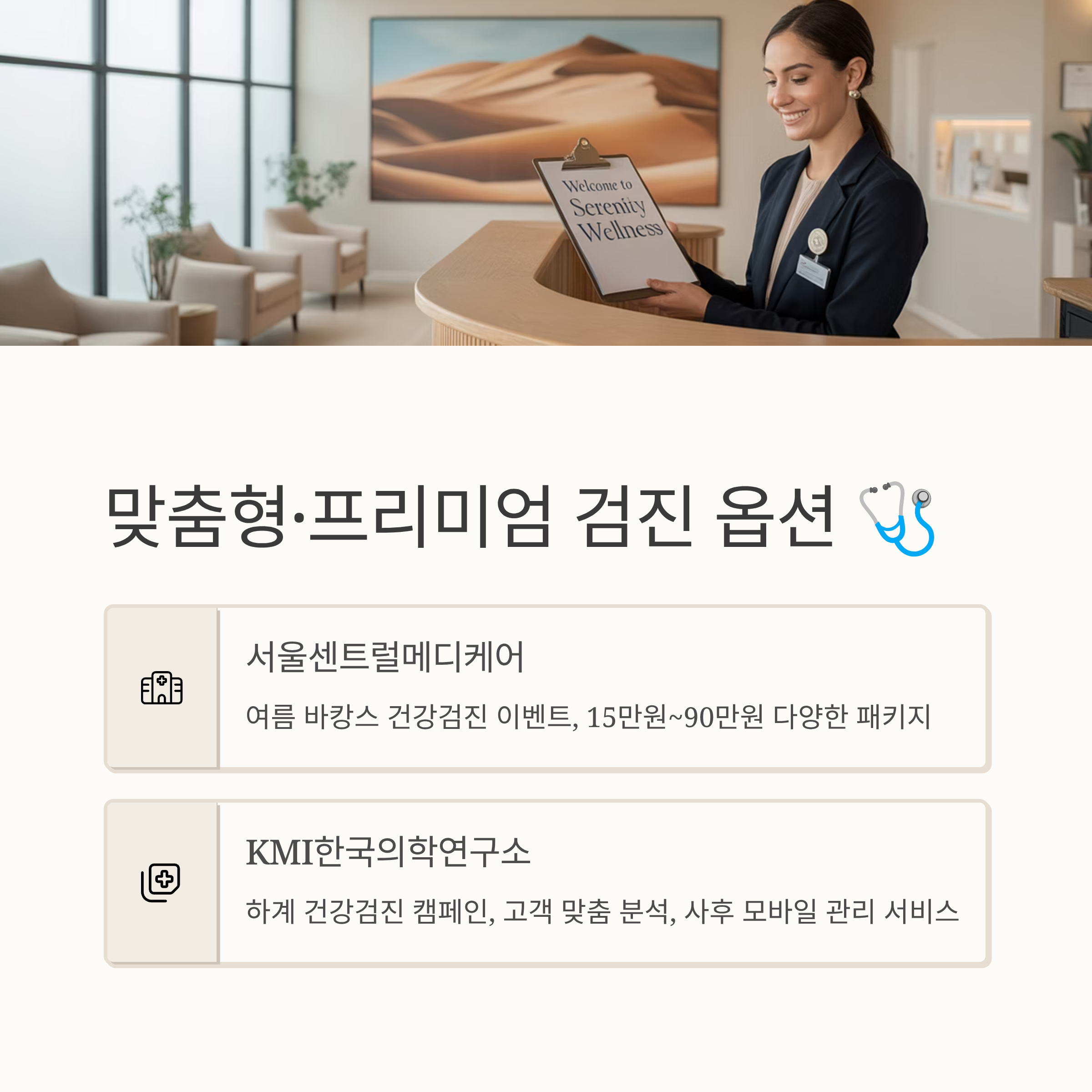 국가검진 외에도 내 몸에 꼭 맞는 맞춤형 검진을 찾고 계신다면 주목! 서울센트럴메디케어 같은 일부 기관에서는 ‘여름 바캉스 건강검진 이벤트’를 진행하기도 해요. 15만 원부터 90만 원까지 다양한 가격대의 프리미엄 패키지가 있어서, 혼자든, 배우자와 함께든 우리 가족 건강을 제대로 챙길 수 있죠. 이벤트 기간 중에는 추가 혜택도 팡팡 터진다고 하니, 이런 기회 놓치지 마시고요! 😉