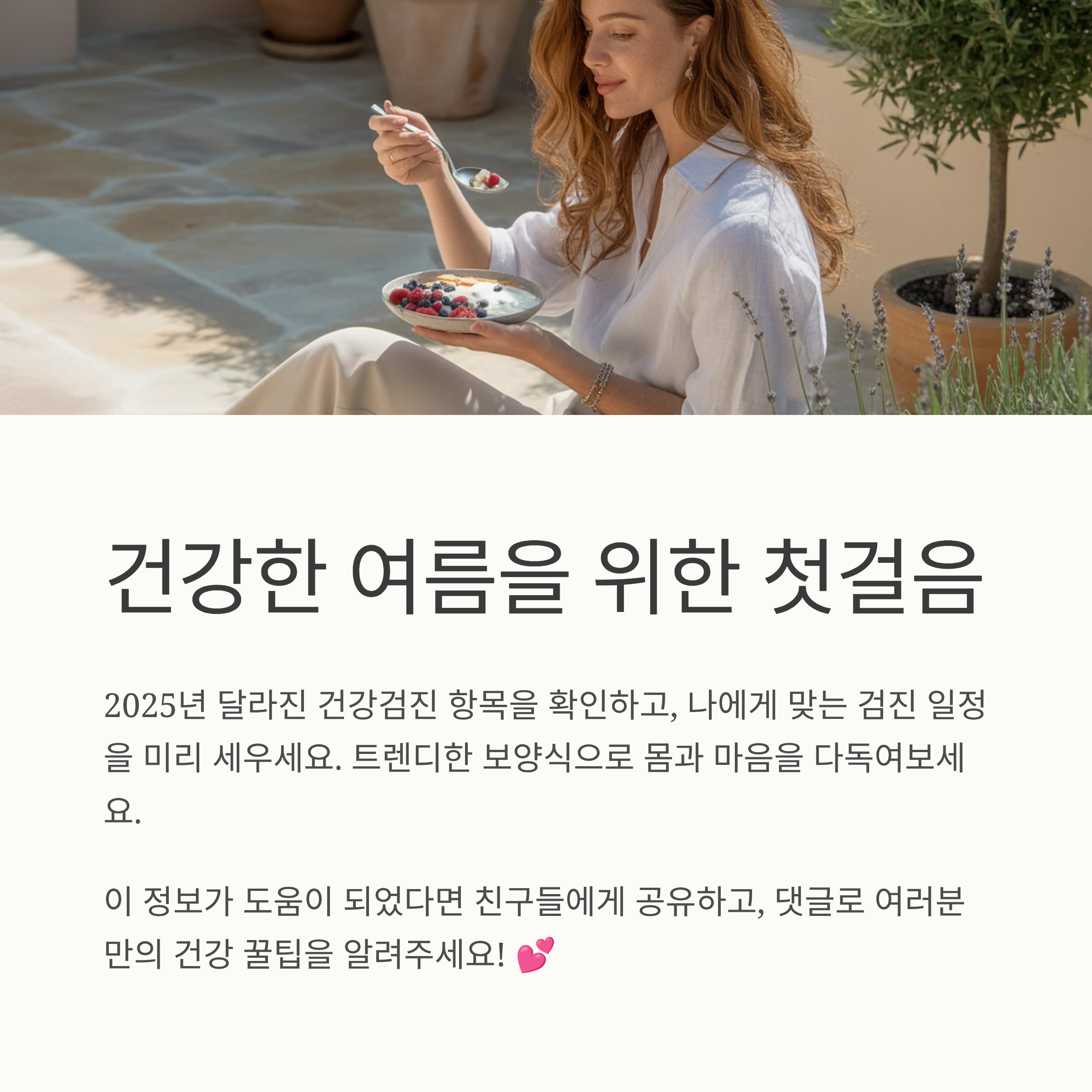 여러분, 여름은 무더운 만큼 우리 몸을 돌아보고 더 건강하게 채울 수 있는 기회의 계절이에요. 2025년 달라진 건강검진 항목을 꼼꼼히 확인하고, 나에게 맞는 검진 일정을 미리 세우는 현명함을 보여주세요. 그리고 무더운 하루, 체력 저하와 건강 리스크에 대비해 트렌디한 보양식으로 몸과 마음을 다독여 보세요. 한 끼에 몸을, 일상에 건강을, 남보다 한 발 앞서 ‘내 건강을 바로 세우는 2025 한여름’이 되길 바랍니다. 더 궁금한 점이 있다면 언제든 댓글로 물어봐주세요! 😊
