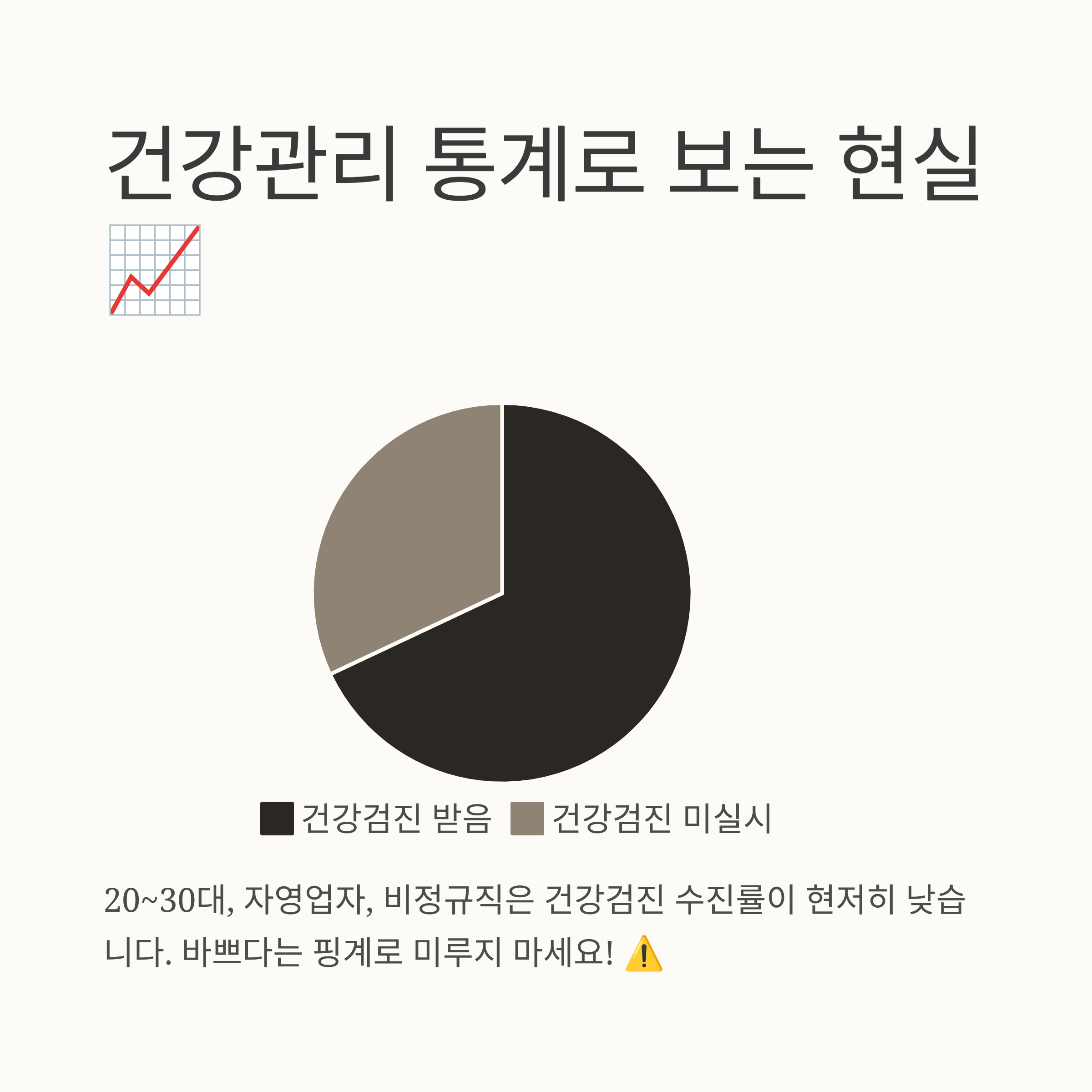 혹시 20~30대이거나, 자영업자, 비정규직이신가요? 바쁘다는 핑계로 건강검진을 미루고 있다면, 지금 바로 예약하세요! 당신의 건강은 당신이 생각하는 것보다 훨씬 소중하답니다.