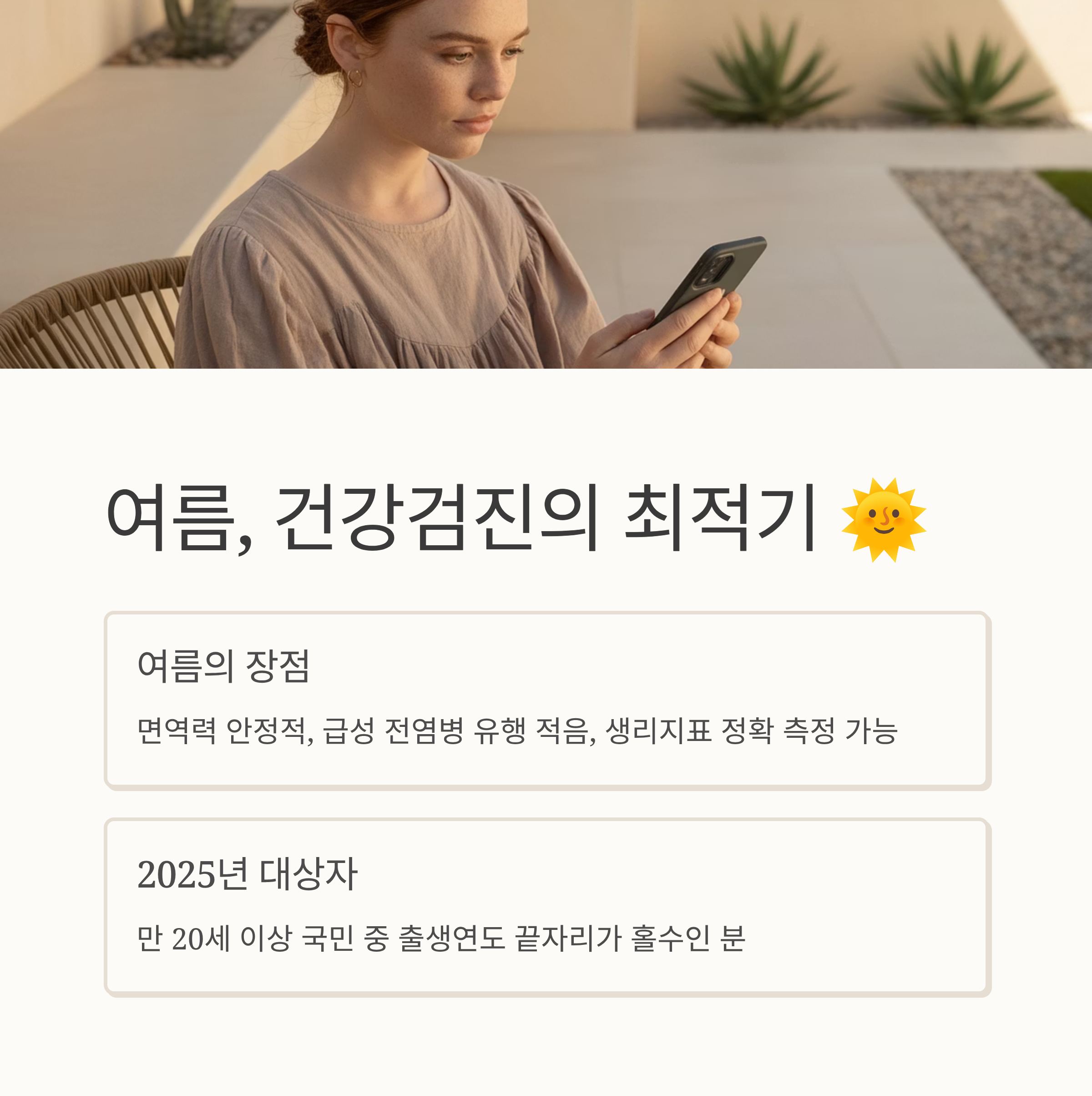 - 건강검진은 여름에! 여름은 면역력이 안정적이고 생리지표 측정이 정확해서 검진하기 딱 좋은 시기예요. 2025년 달라진 항목들(C형간염, 정신건강, 골다공증 등) 꼭 확인하고 미리미리 예약하세요!