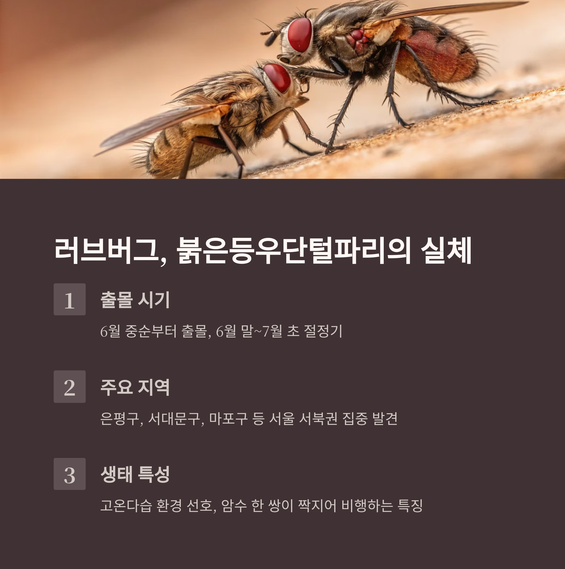 | 러브버그 | 6월 중~7월 초 | 은평구, 마포구 등 |