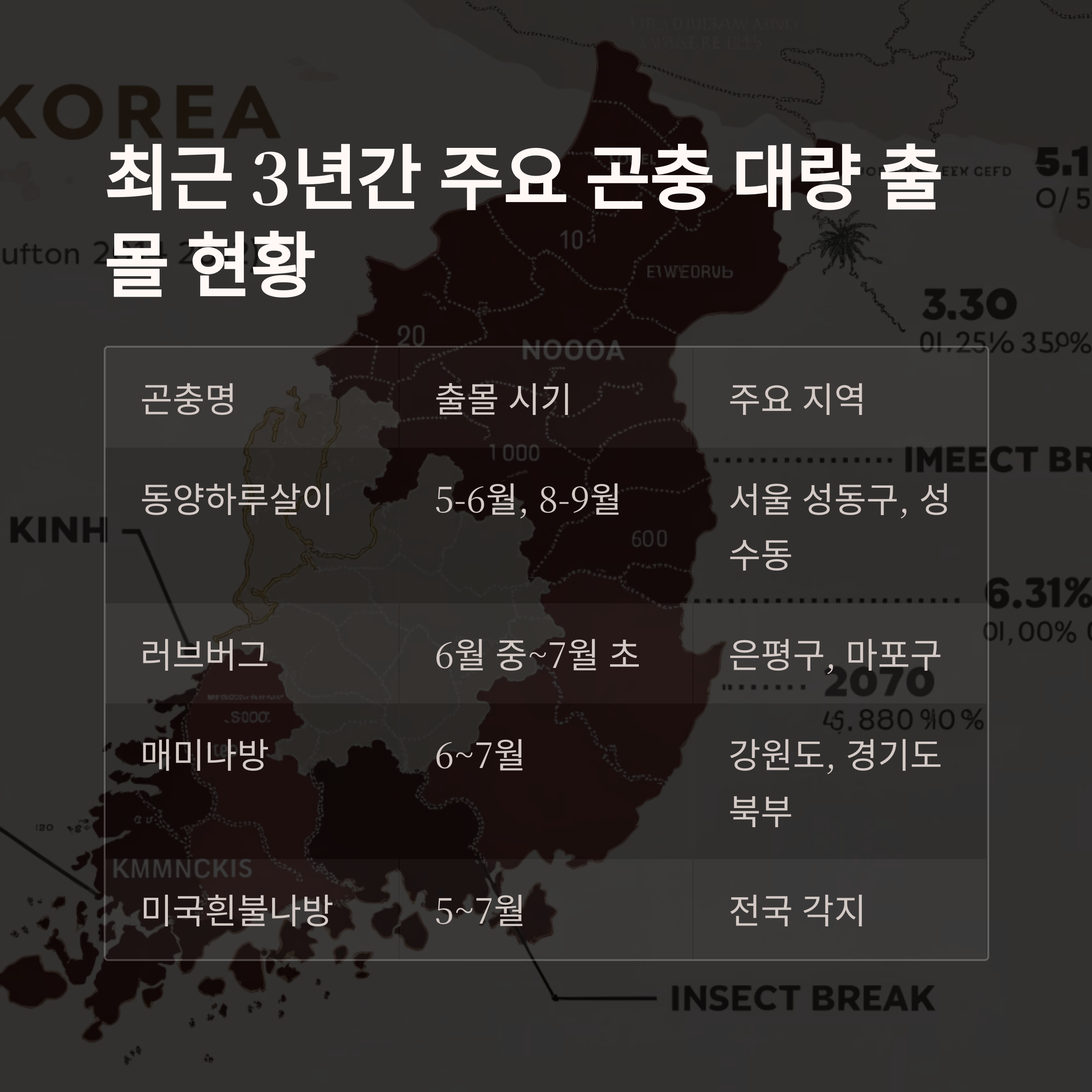 아래 표는 최근 3년간 주요 곤충들의 대량 출몰 시기와