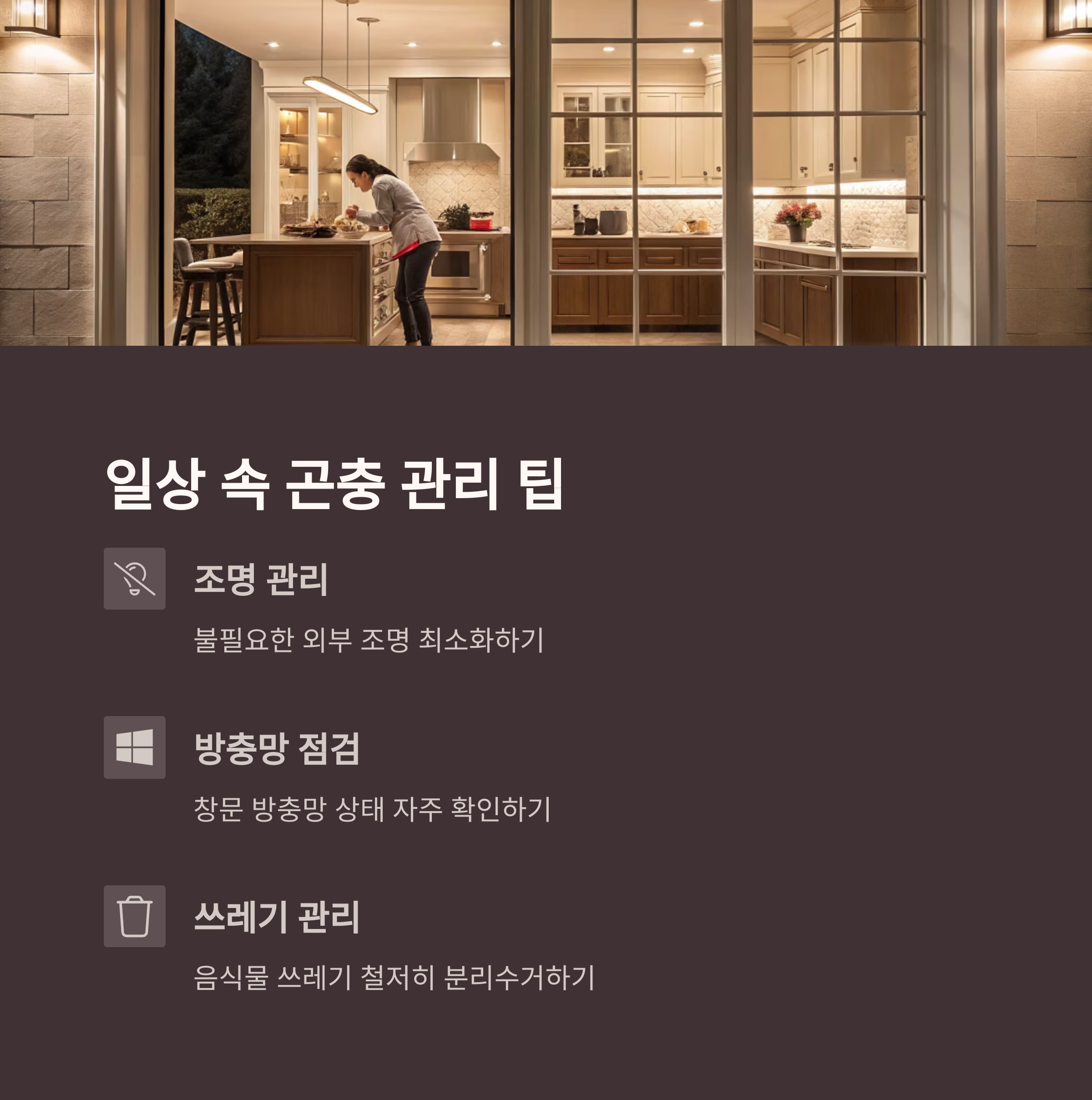 | 불필요한 조명 줄이기 | 곤충은 빛에 끌리므로 외부 조명을 최소화합니다. |