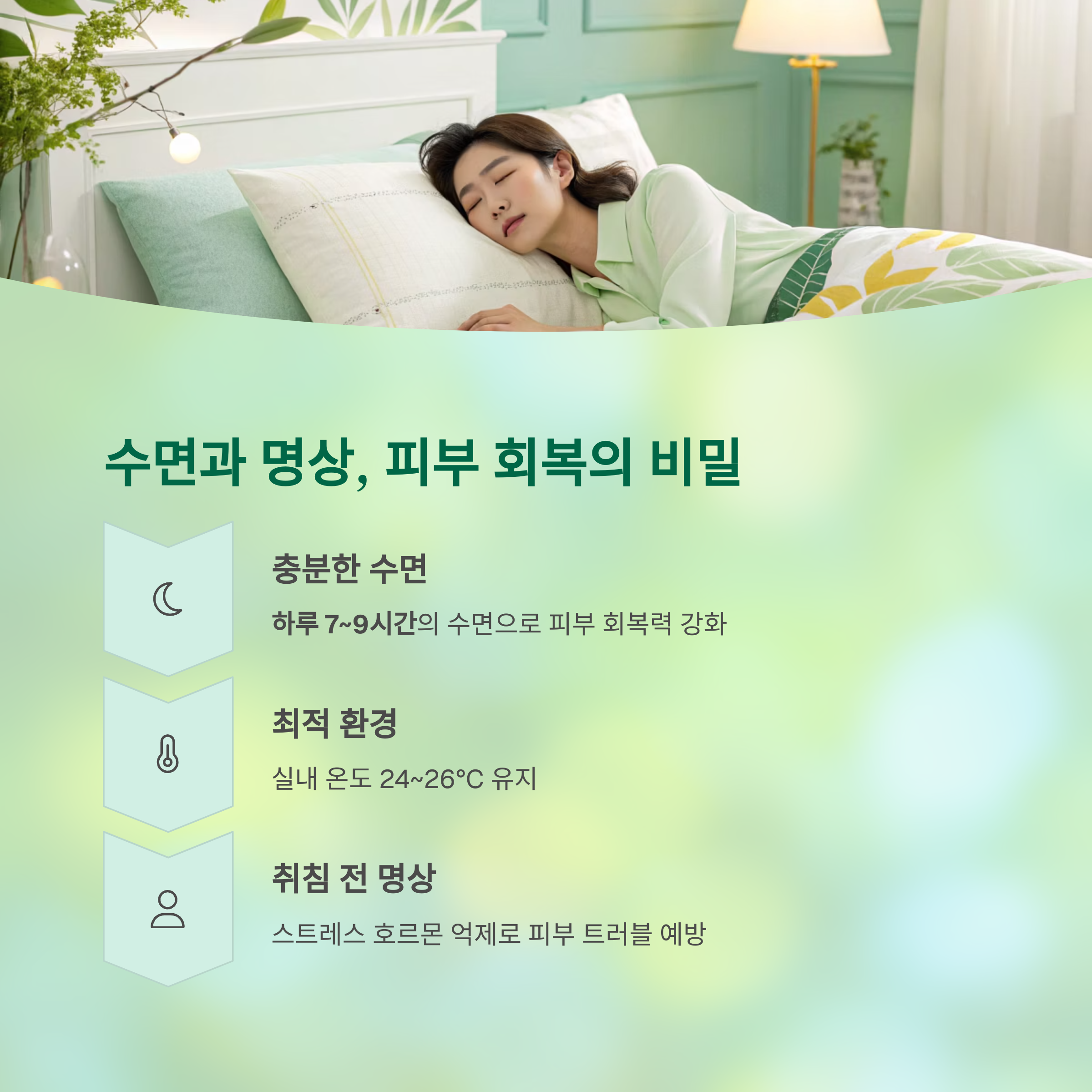 하루 7~9시간의 충분한 수면과 취침 전 명상 습관은 피부 회복에 큰 도움이 됩니다
