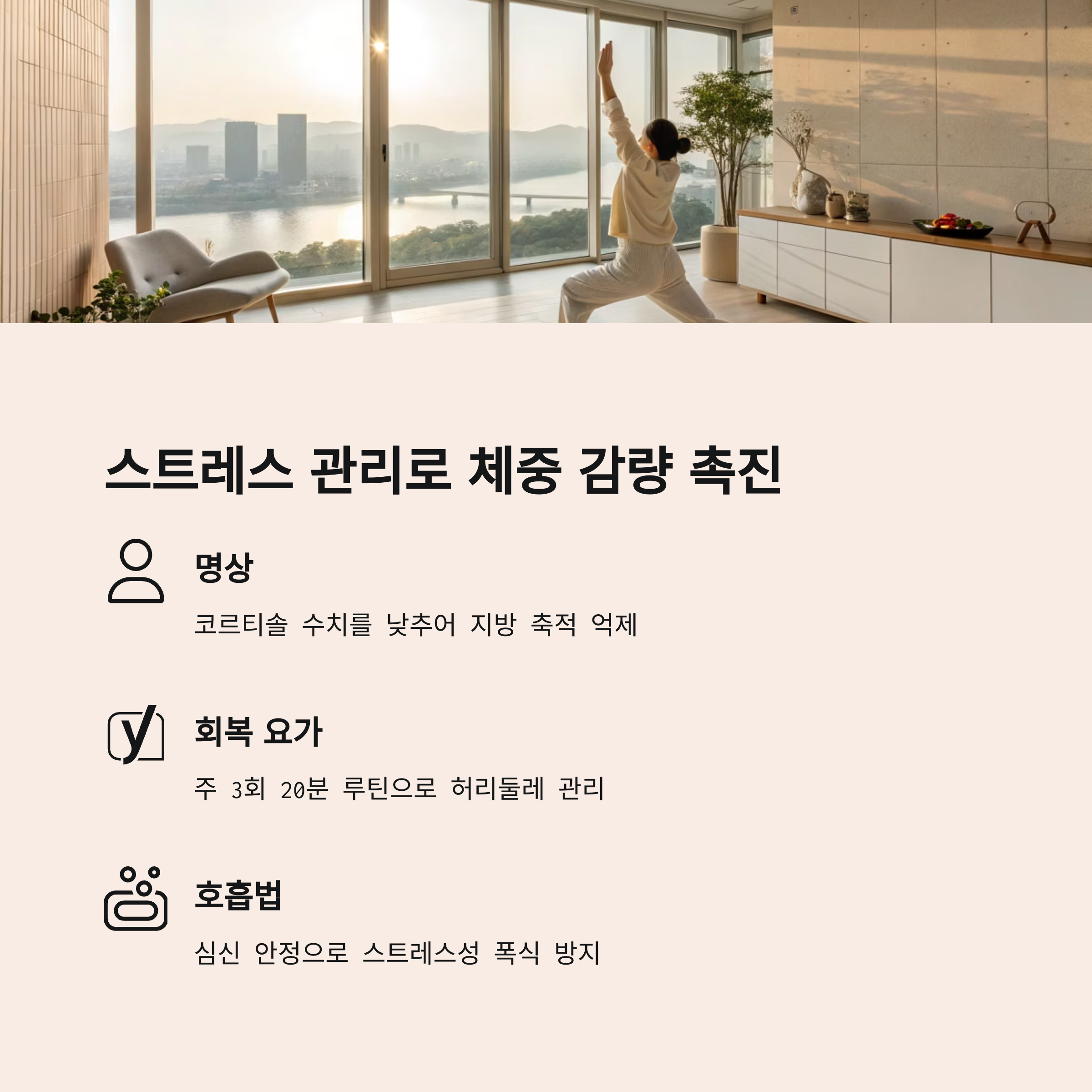 심신 안정 루틴은 코르티솔 수치를 낮추어 지방 축적을 억제하는 효과가 있습니다