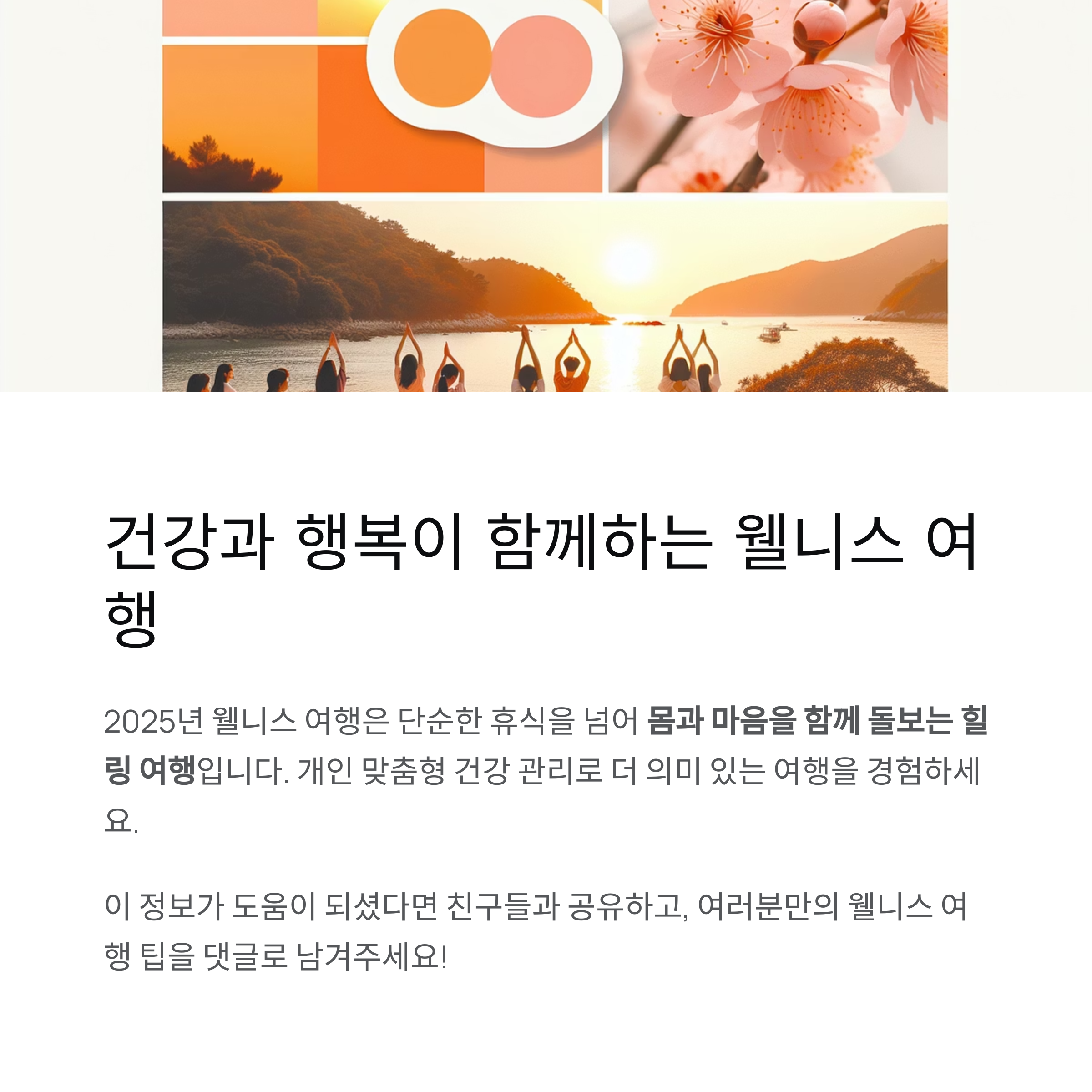 웰니스 여행은 단순한 휴식을 넘어 몸과 마음을 함께 돌보는 힐링 여행으로, 건강한 삶을 위한 소중한 시간이 될 것입니다.