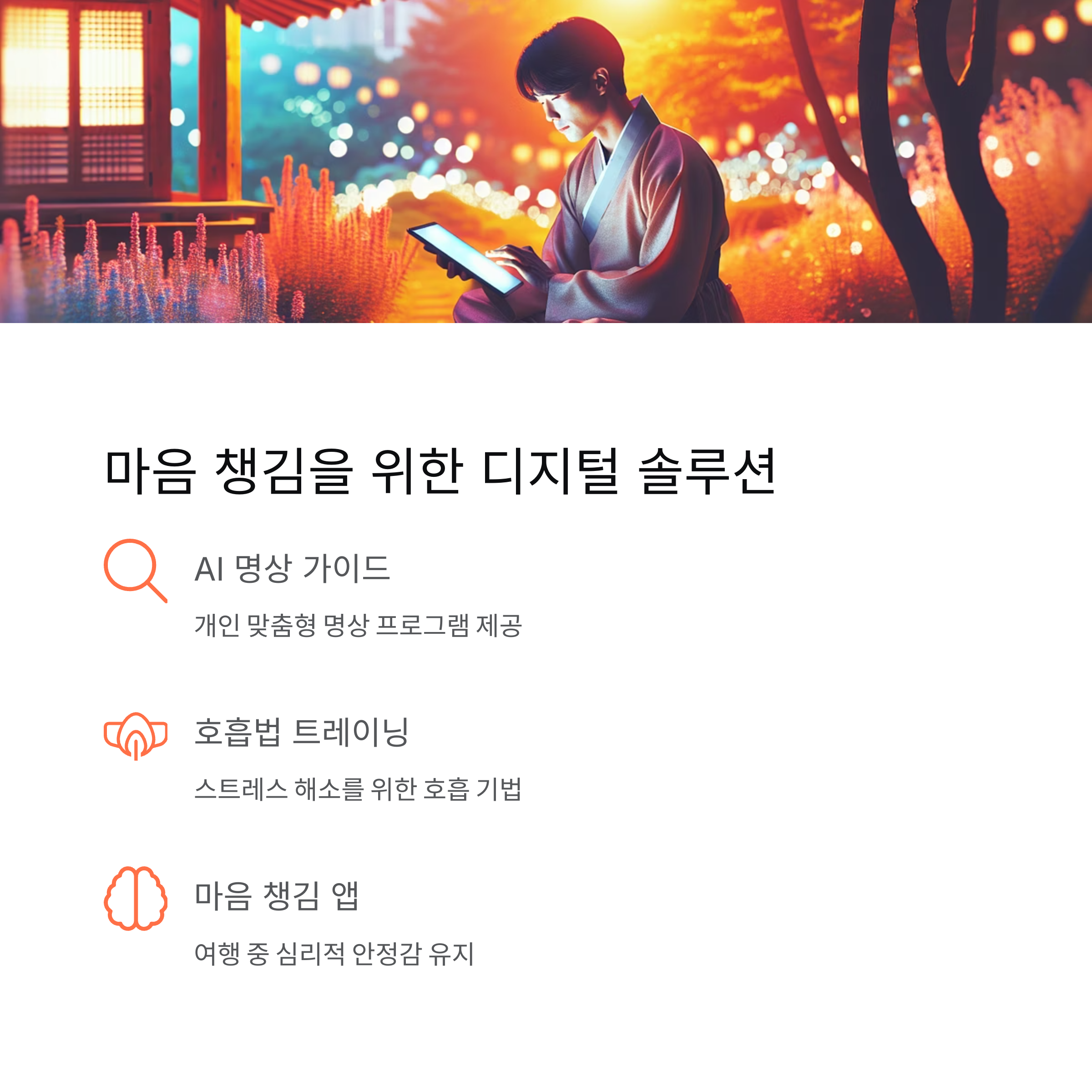 오디오 명상, 호흡법 가이드, 마음 챙김 프로그램을 통해 여행 중에도 심리적 안정감을 유지할 수 있습니다.
