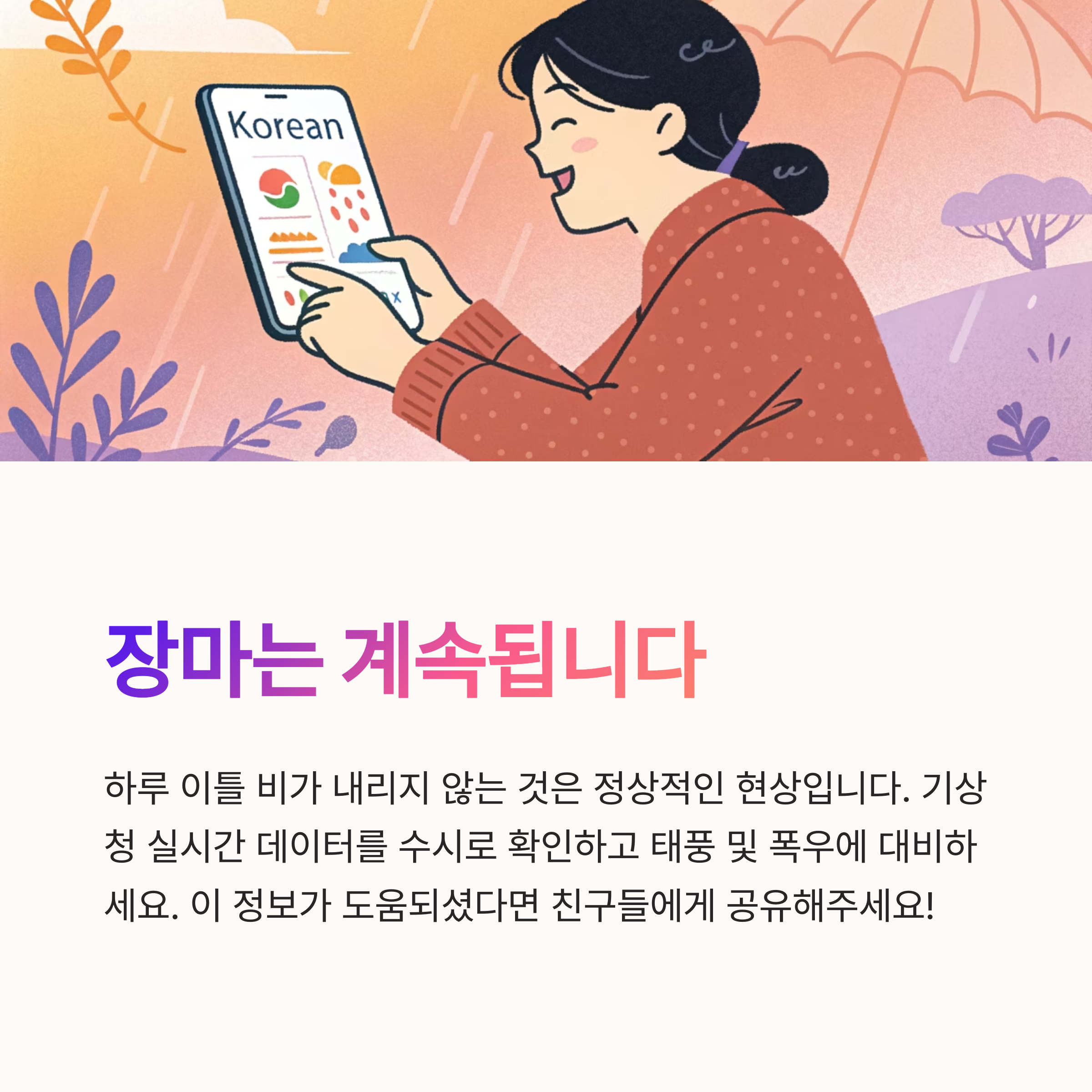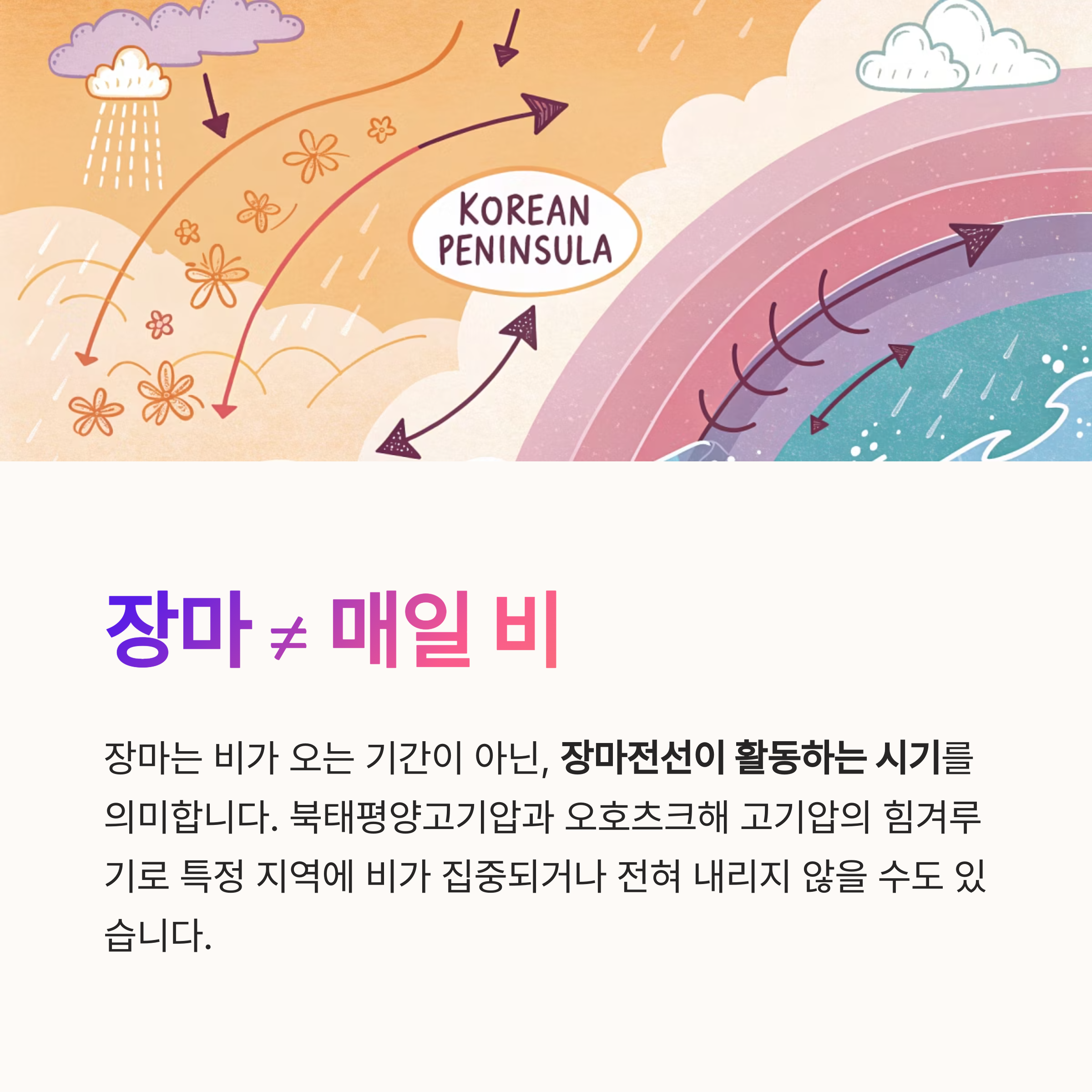 "장마기간 = 매일 비"는 아닙니다. 실제 장마는 비가 오는 기간이 아닌, 장마전선이 활동하는 시기를 의미합니다.