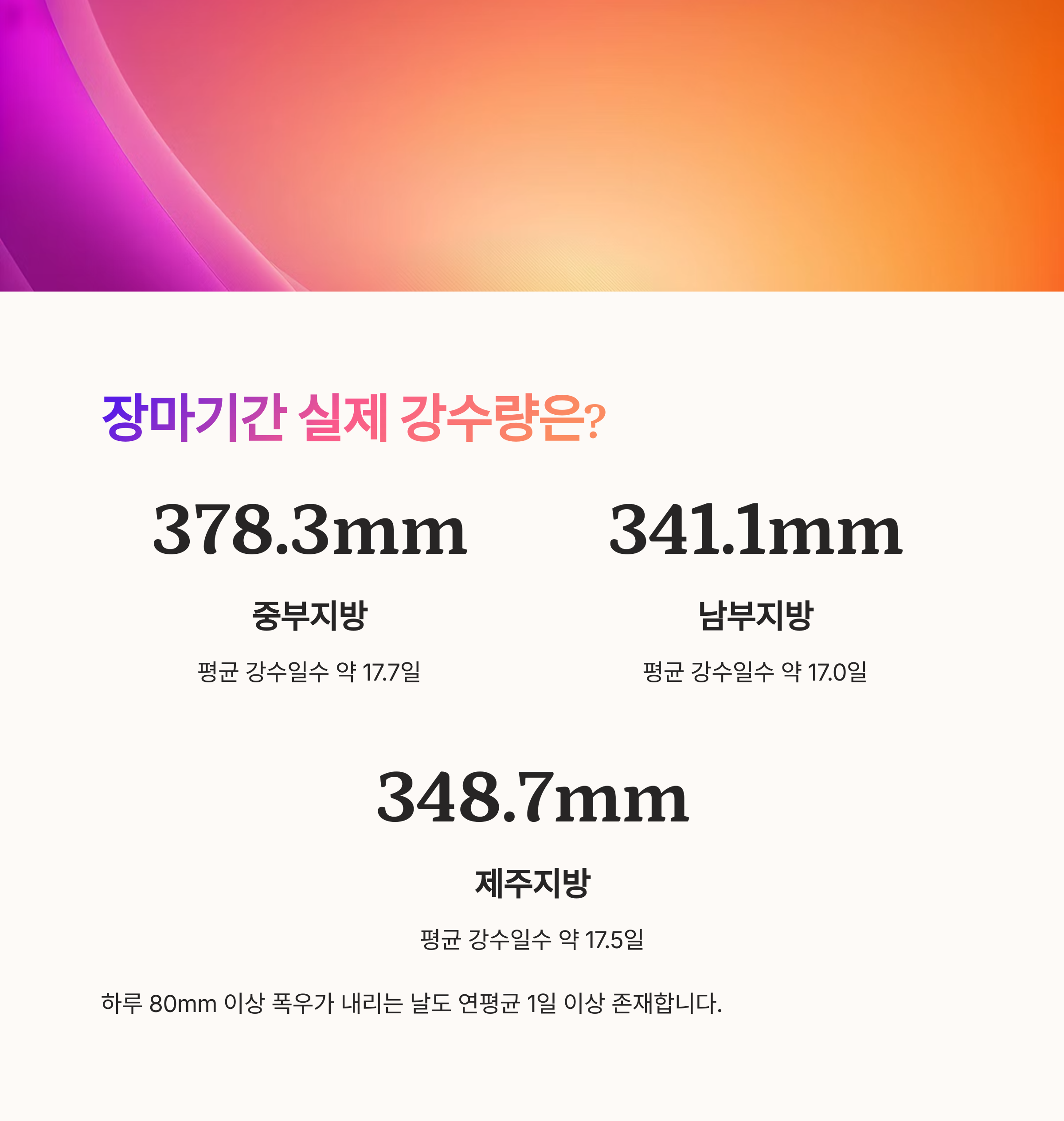 하루 80mm 이상 폭우가 내리는 날도 연평균 1일 이상 존재하며, 기후변화로 인해 특정 연도에는 그 빈도와 강도가 훨씬 높을 수 있습니다.