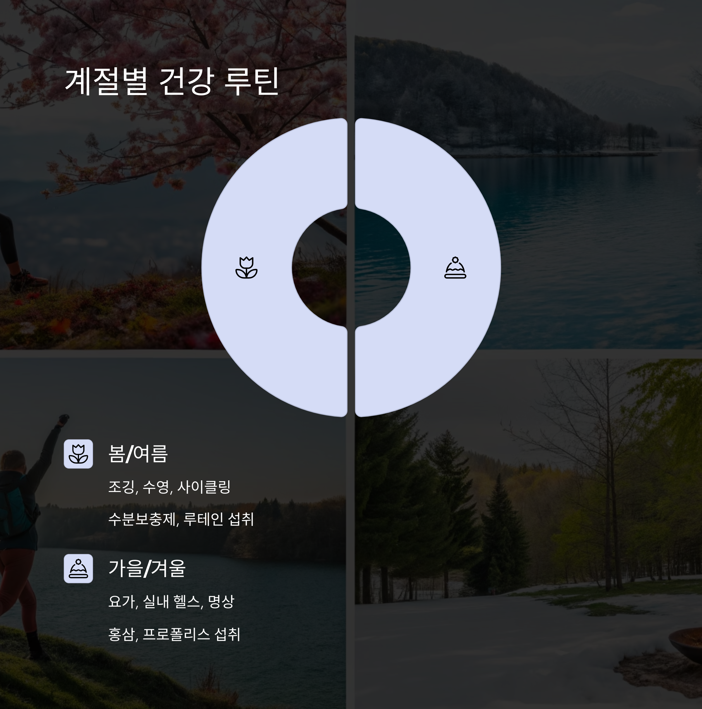 | 가을/겨울 | 요가, 실내 헬스, 명상 | 홍삼, 프로폴리스 |