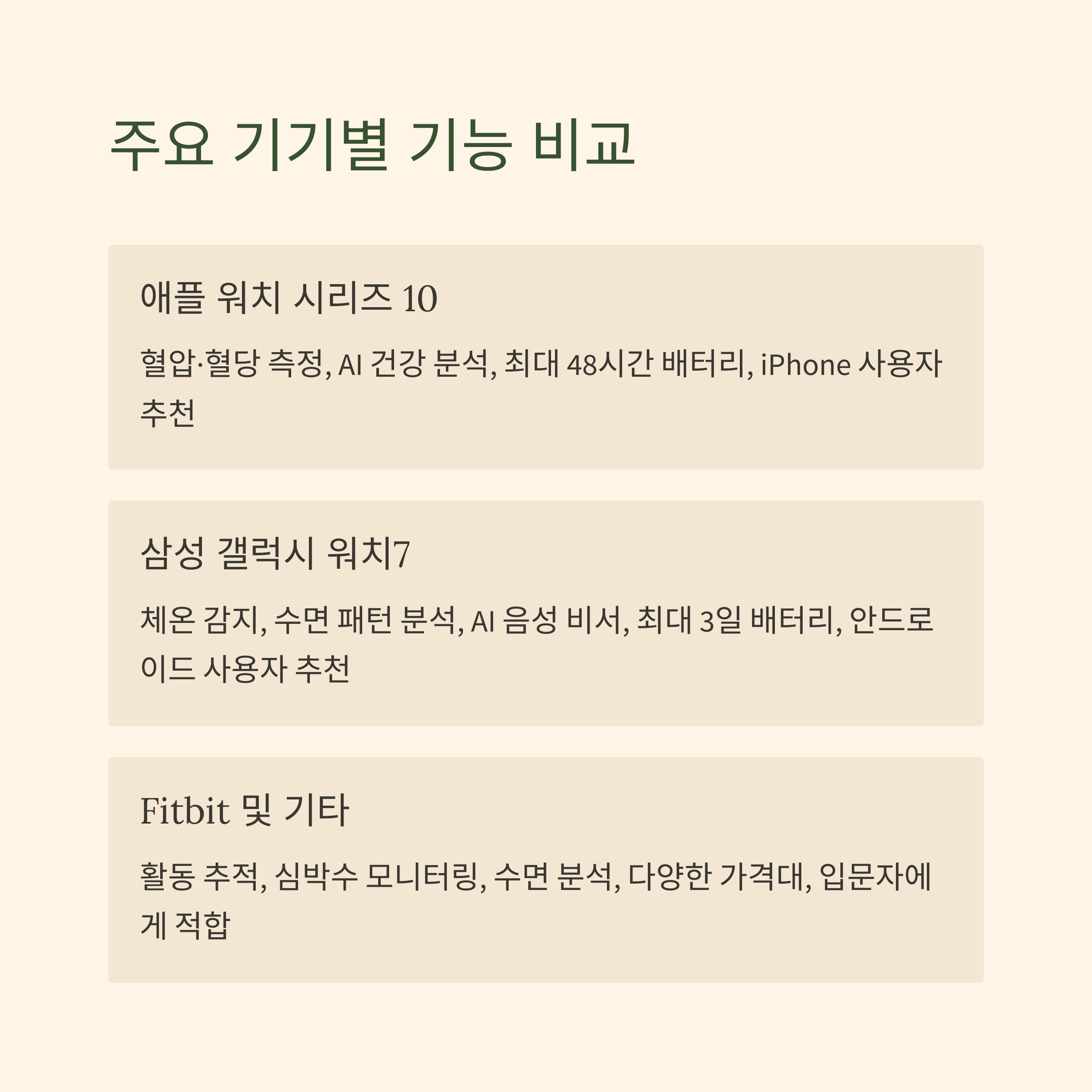 | 애플 워치 시리즈 10 | 혈압·혈당 측정, AI 건강 분석 | 최대 48시간 | 정밀한 건강 분석, iPhone 사용자 추천 |