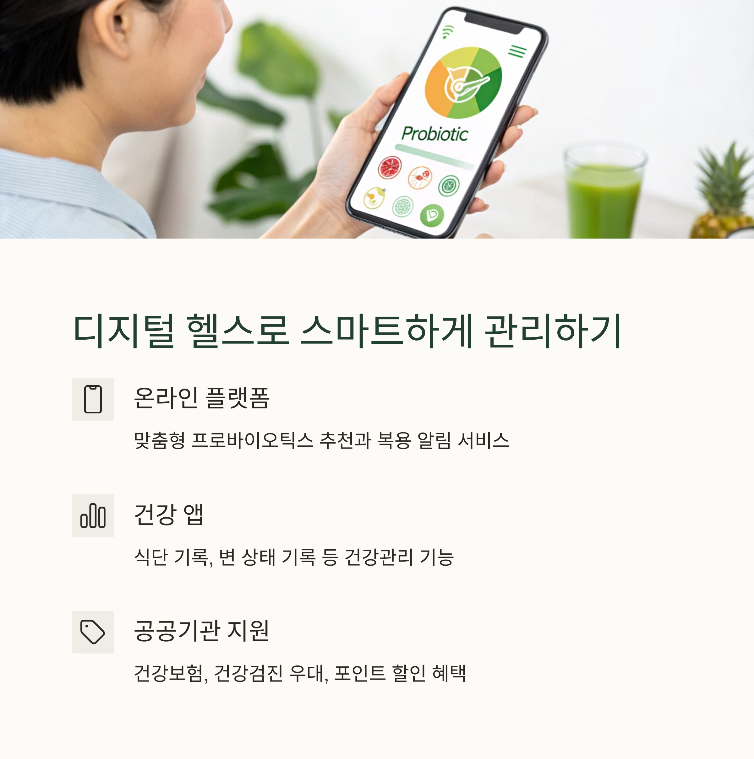 온라인 플랫폼, 건강 앱을 통해 개인 맞춤 프로바이오틱스를 추천받고