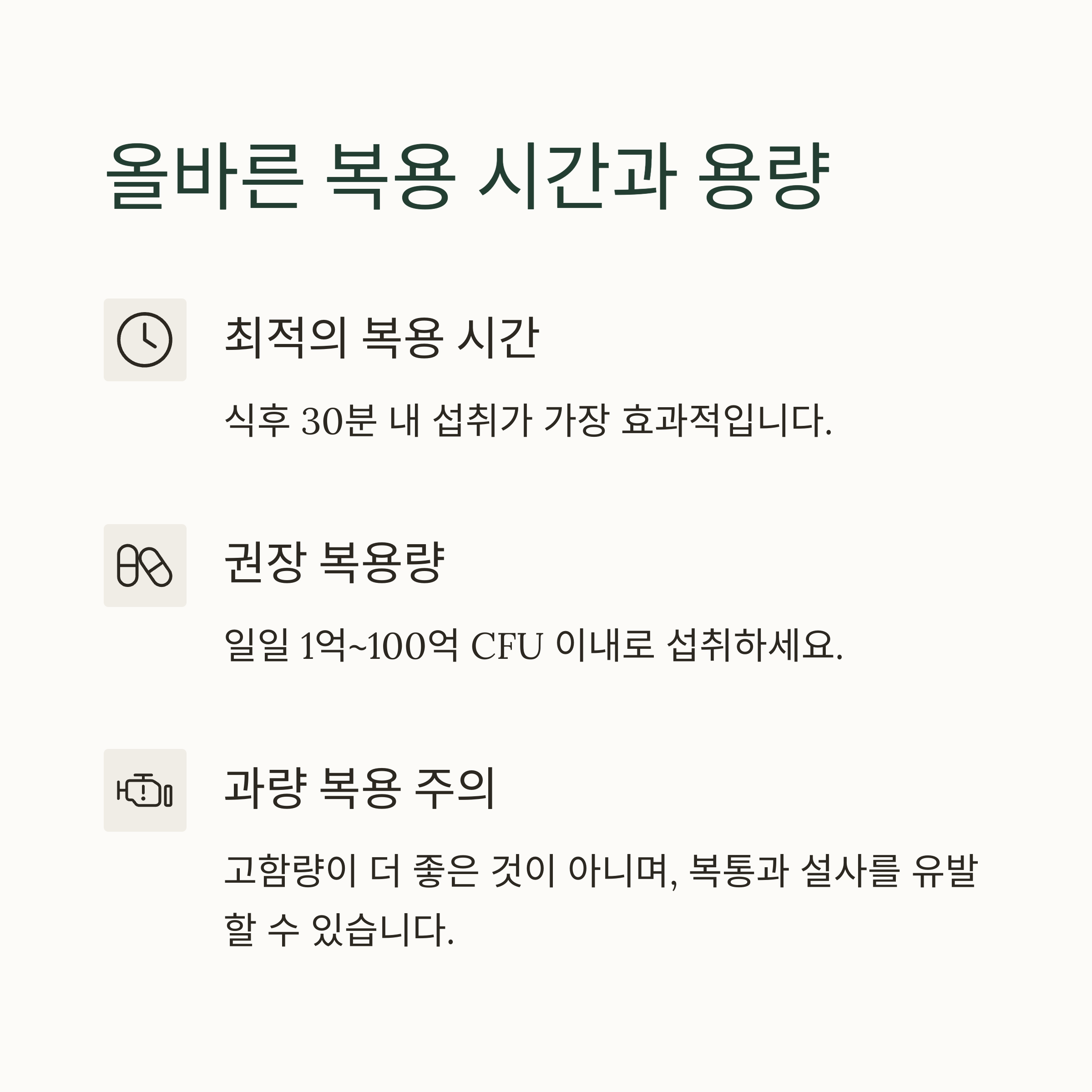 식후 30분 내 섭취가 가장 좋으며, 일일 1억~100억 CFU 이내가 권장됩니다.
