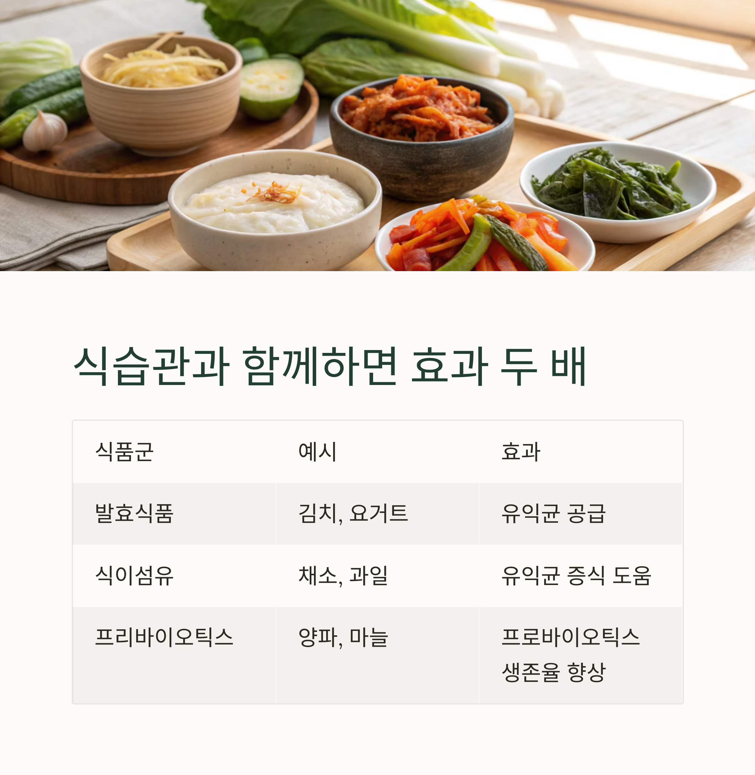 | 발효식품 | 김치, 요거트 | 유익균 공급 |