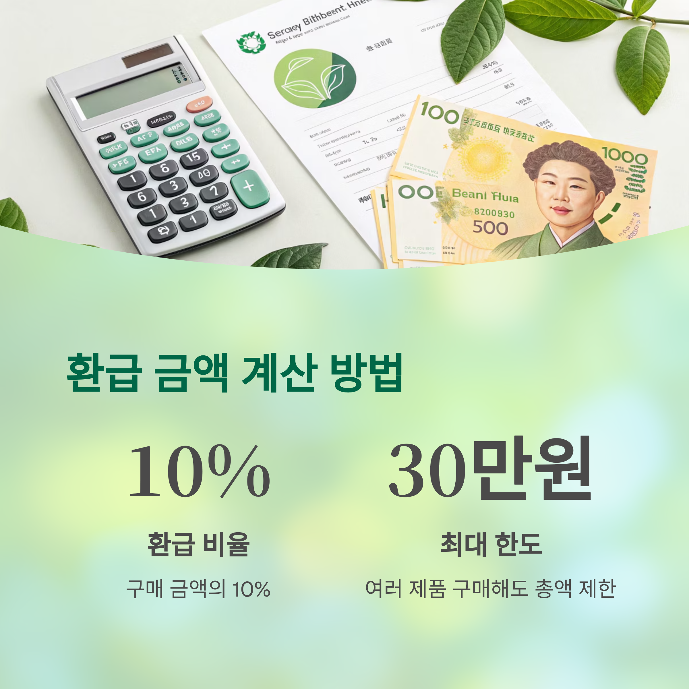환급금은 구매금액의 10퍼센트이며, 최대 30만원 한도입니다.