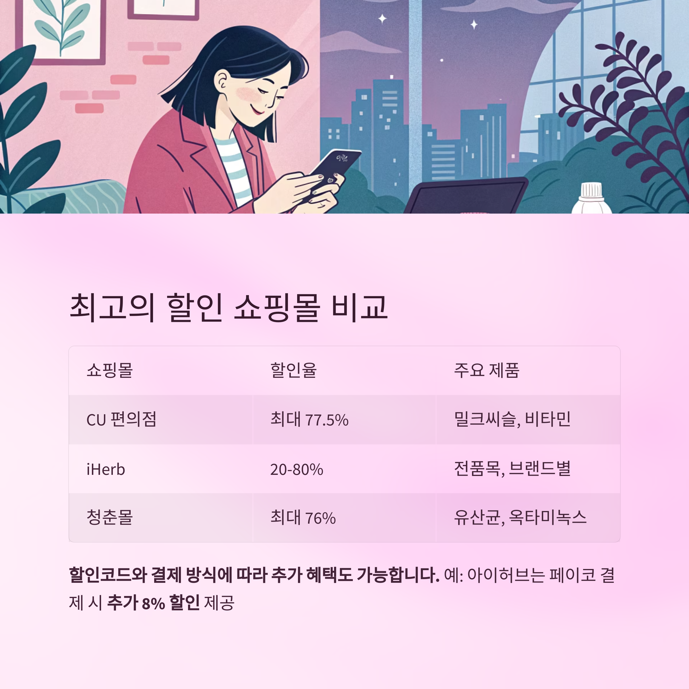예: 아이허브는 페이코 결제 시 추가 8% 할인 제공