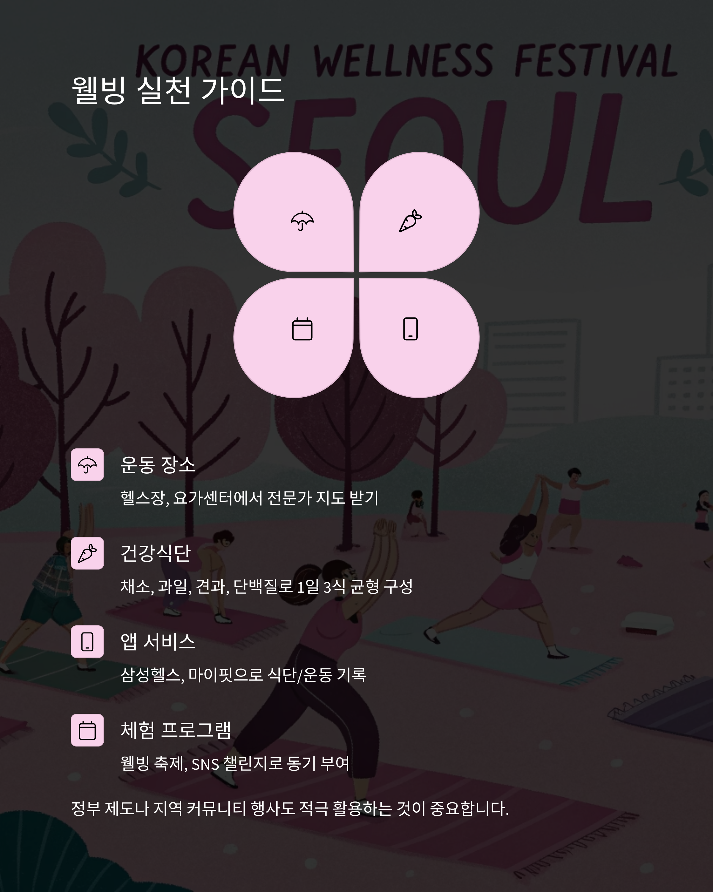 | 체험 프로그램 | 웰빙 축제, SNS 챌린지 | 동기 부여에 효과 |