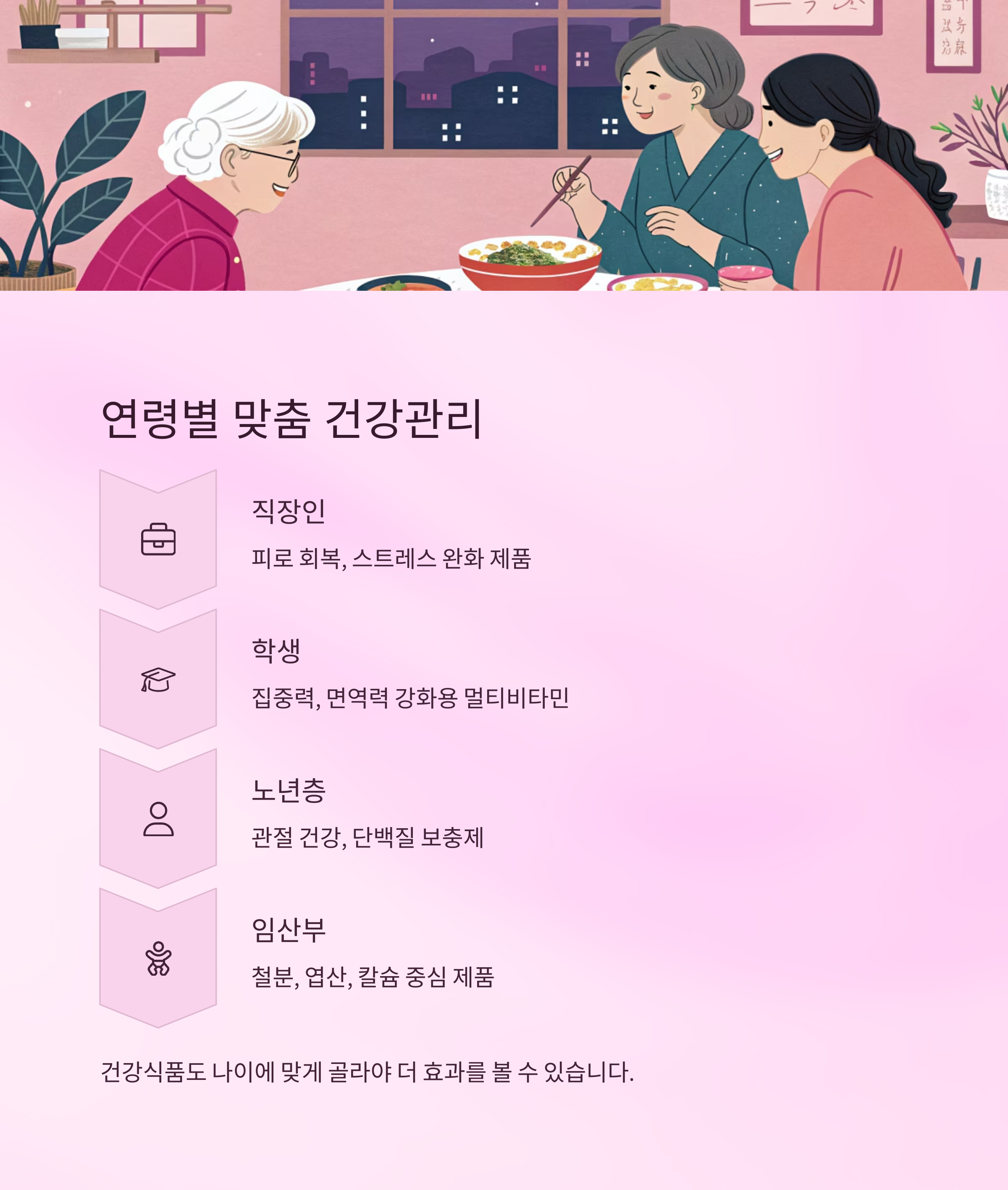 연령과 계절에 따라 건강 중점 항목이 달라집니다.