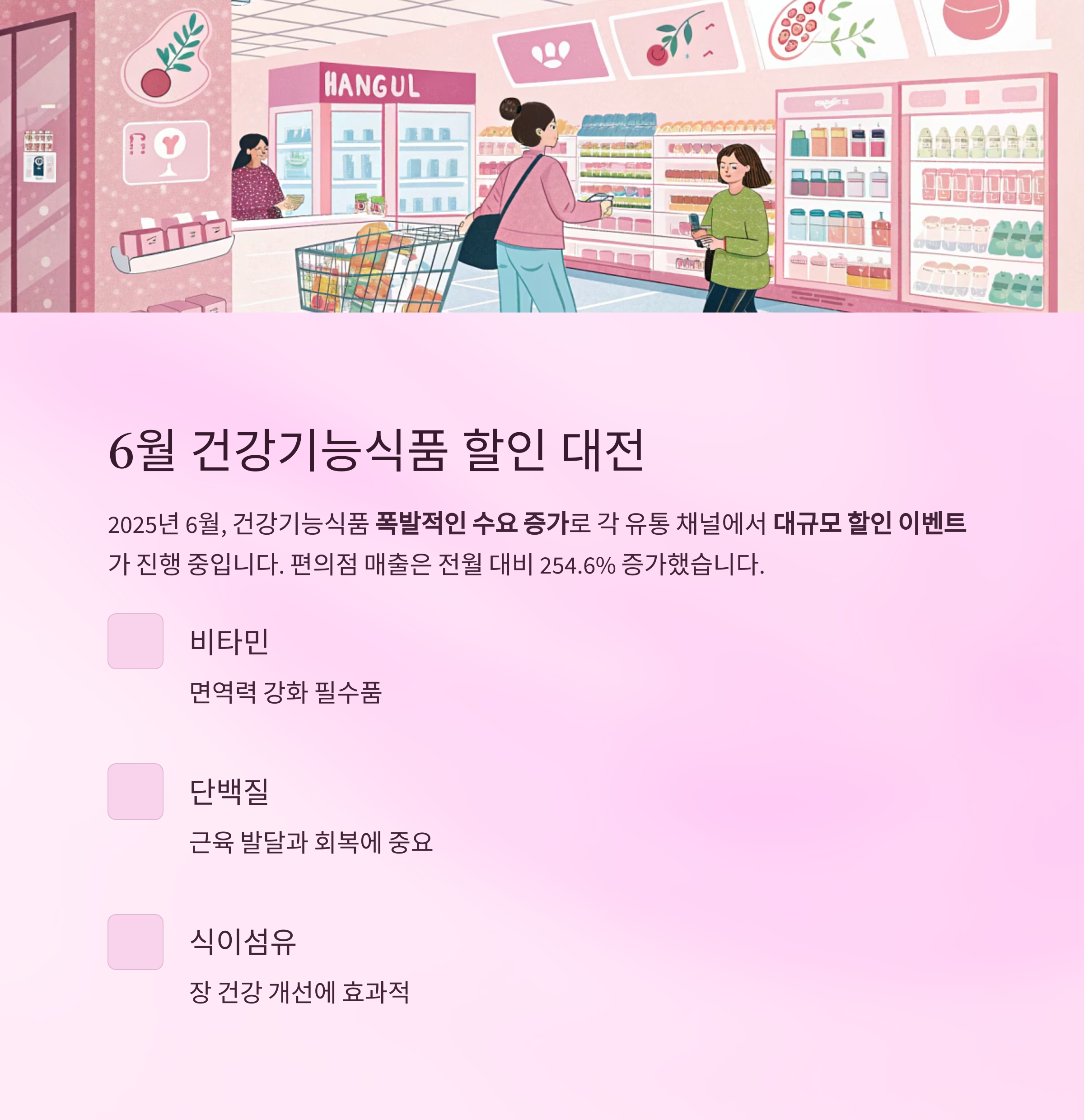 비타민, 단백질, 식이섬유 등 다양한 제품이 주목받고 있습니다.