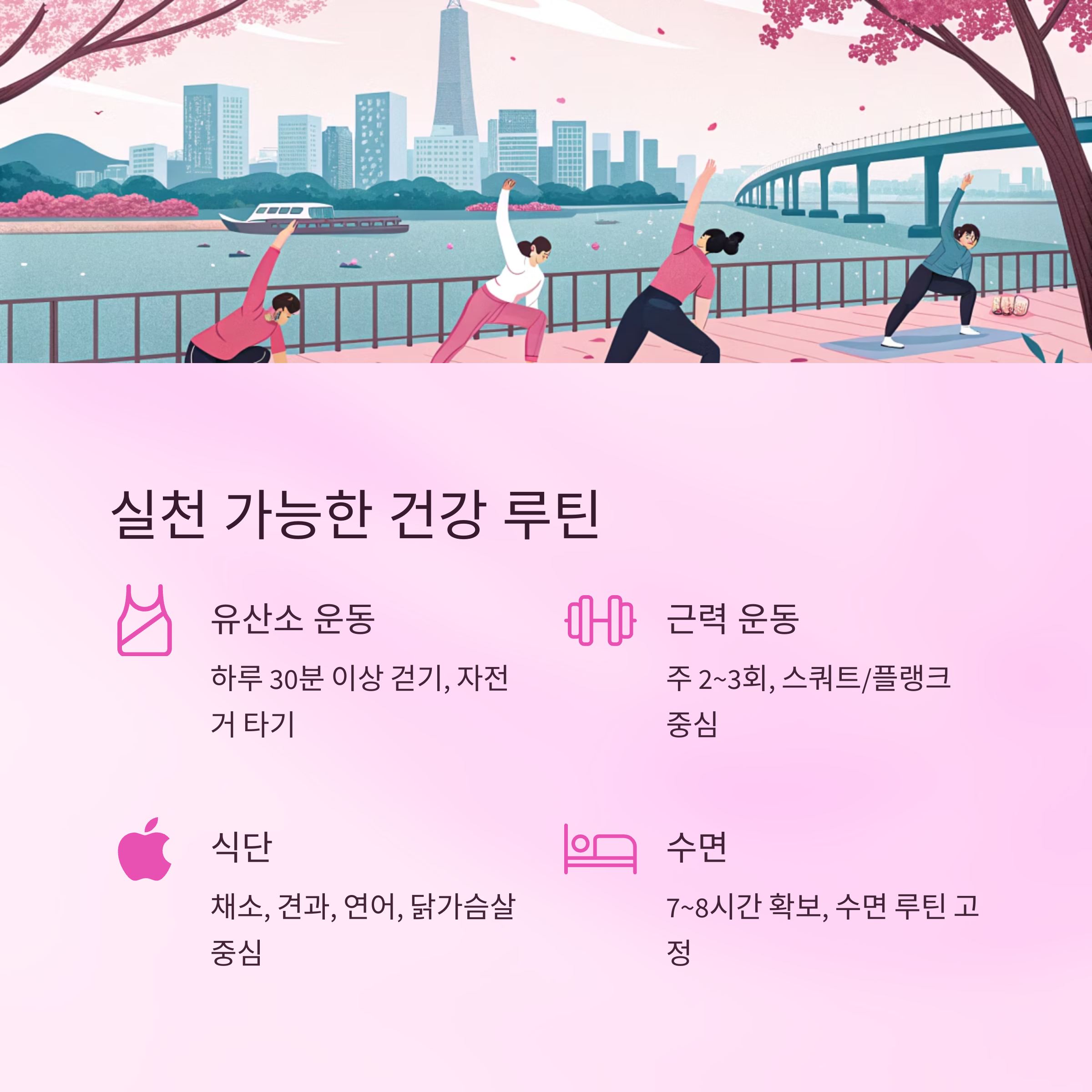 - 수면: 7~8시간 확보, 숙면을 위한 수면 루틴 고정