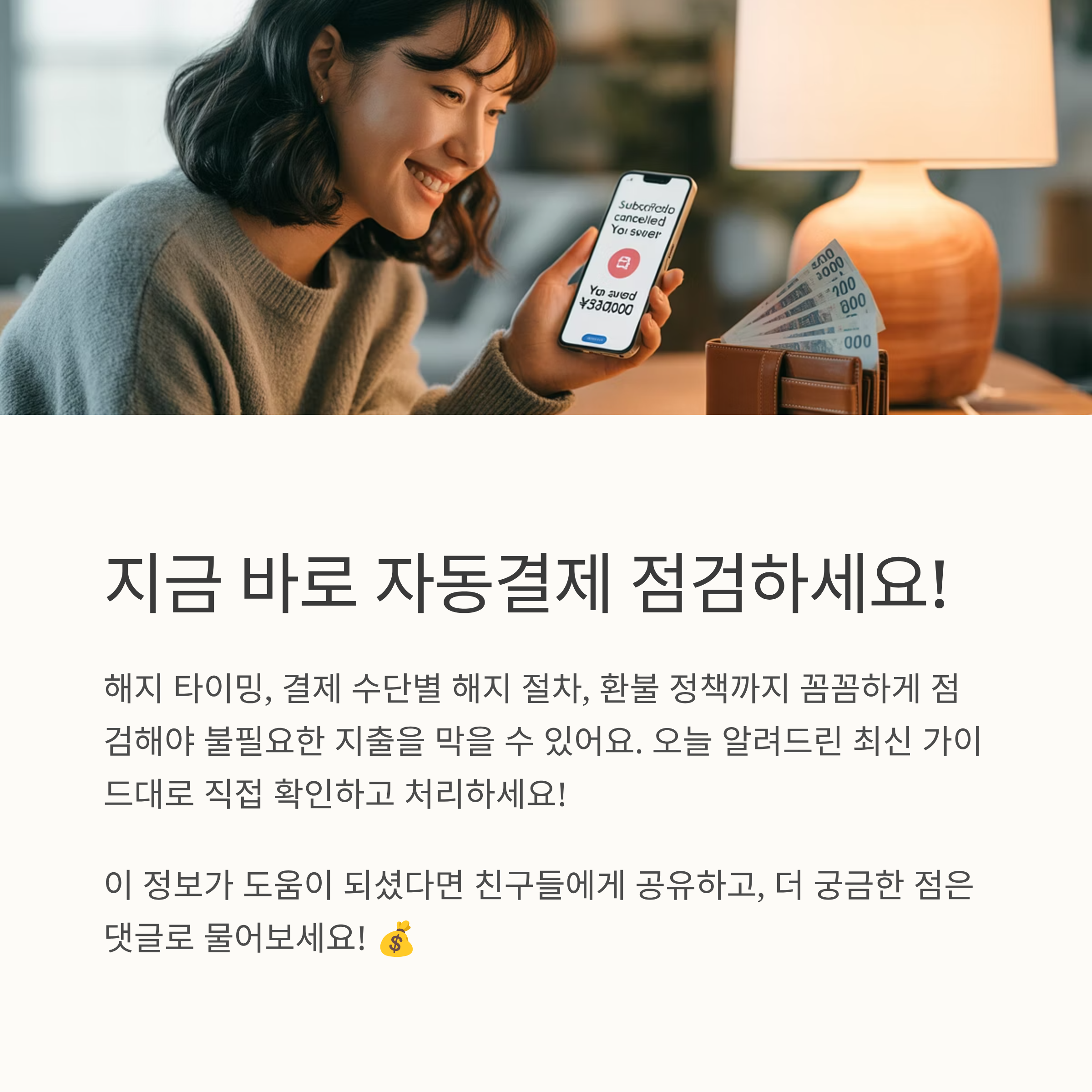 이렇게 보니까 어떠세요? 자동결제, 제대로 관리하지 않으면 내 지갑이 위험할 수 있겠죠? 😅 해지 타이밍, 결제 수단별 해지 절차, 그리고 서비스별 환불 정책까지 꼼꼼하게 점검해야만 불필요한 지출을 막을 수 있어요. GPT 같은 유용한 서비스는 맘껏 누리되, 순간의 실수로 괜한 돈을 낭비하지 않으려면 오늘 제가 알려드린 최신 가이드대로 반드시 직접 확인하고 처리하세요! 2025년 현재, 똑똑한 디지털 소비는 바로 우리 손끝의 꼼꼼함에서 시작된다는 거! 잊지 마세요. 😊
