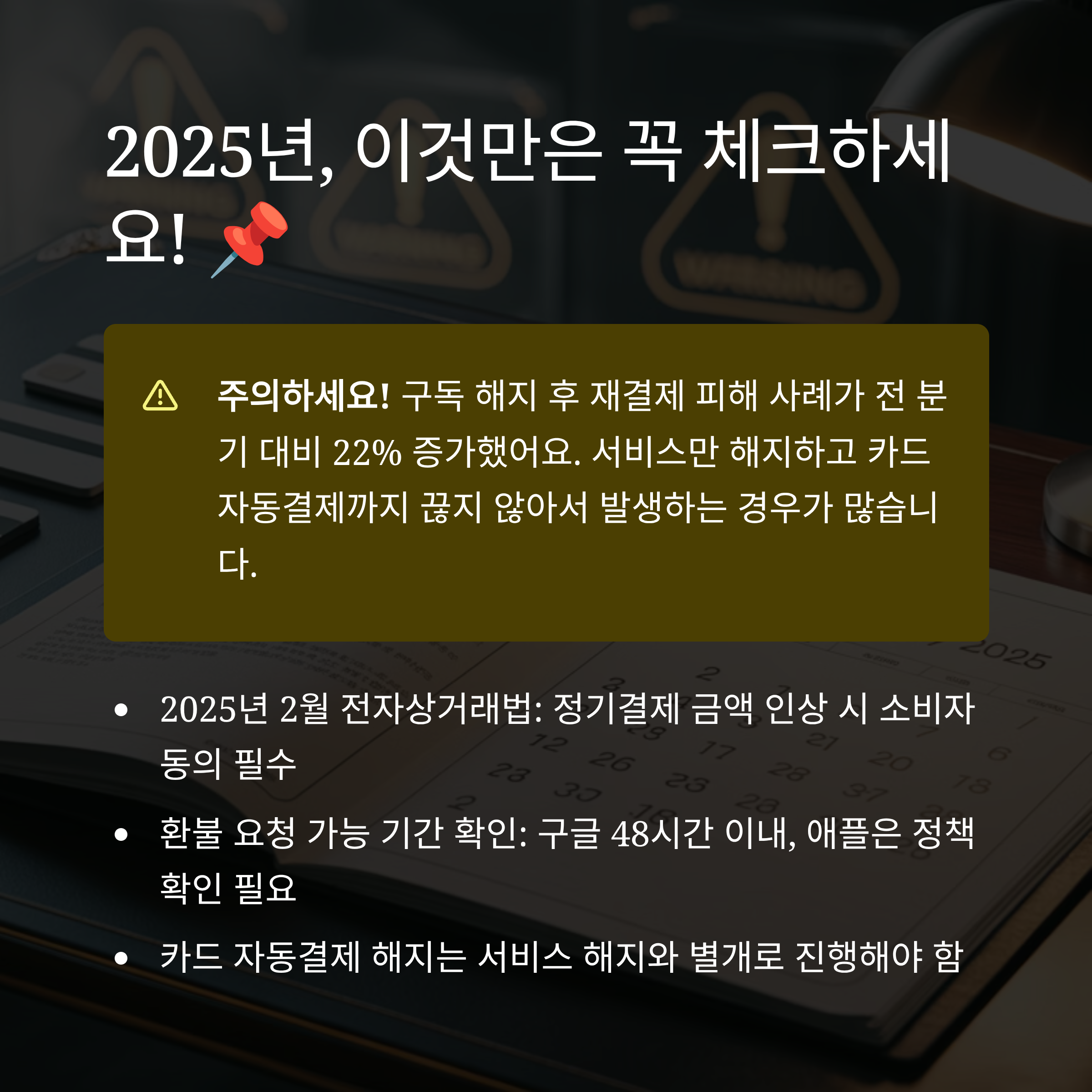 - 법이 바뀌어도 내가 챙겨야 해요! ⚖️ 2025년 2월부터 전자상거래법 개정안이 시행돼서 정기결제 금액이 바뀌거나 조건이 달라지면 무조건 소비자 사전 동의를 받게 되어 있어요. 좋아진 거죠! 하지만 자동결제 해지 자체는 여전히 우리가 직접 챙겨야 한다는 사실! 명심해야 해요.