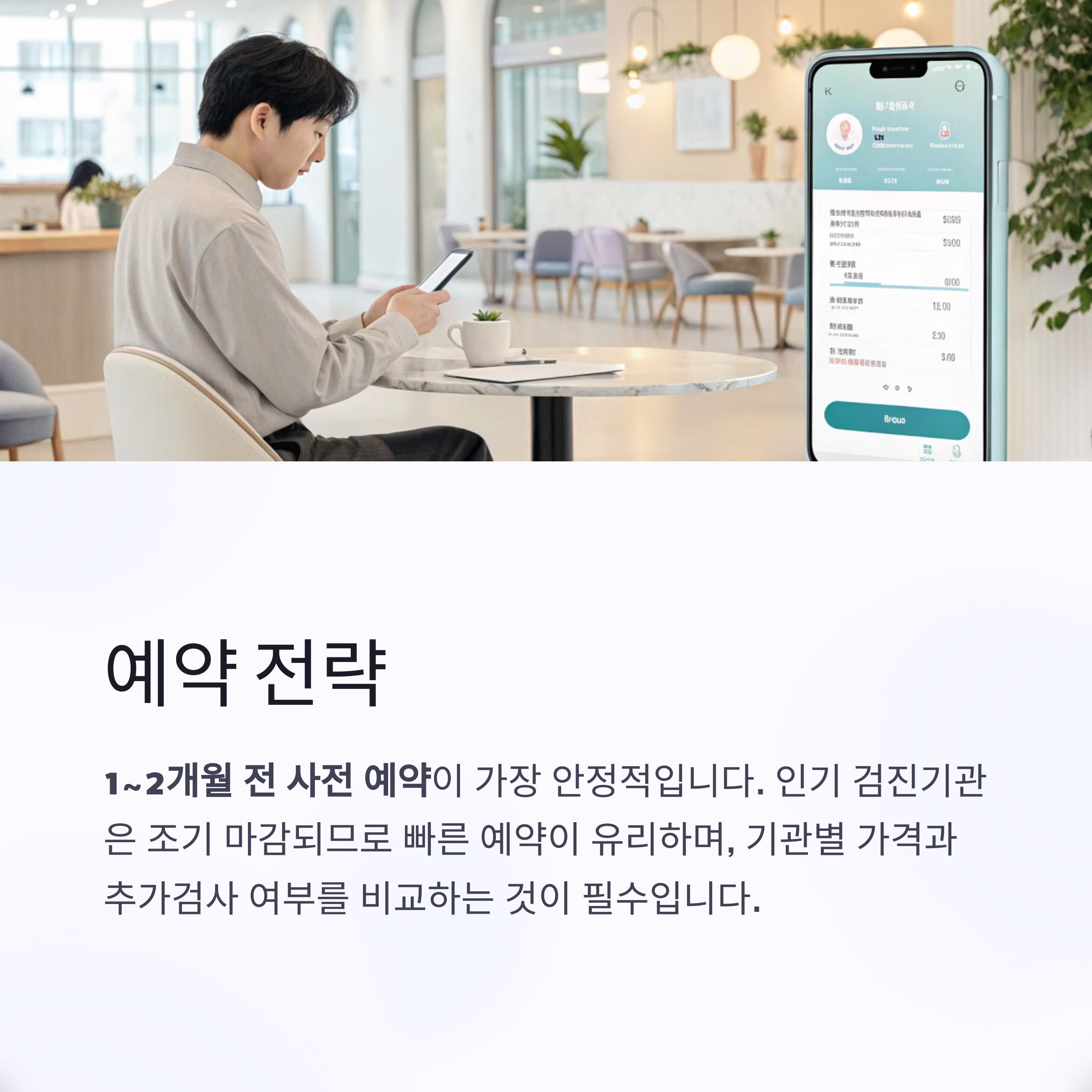 - 인기 검진기관은 조기 마감되므로 빠른 예약이 유리