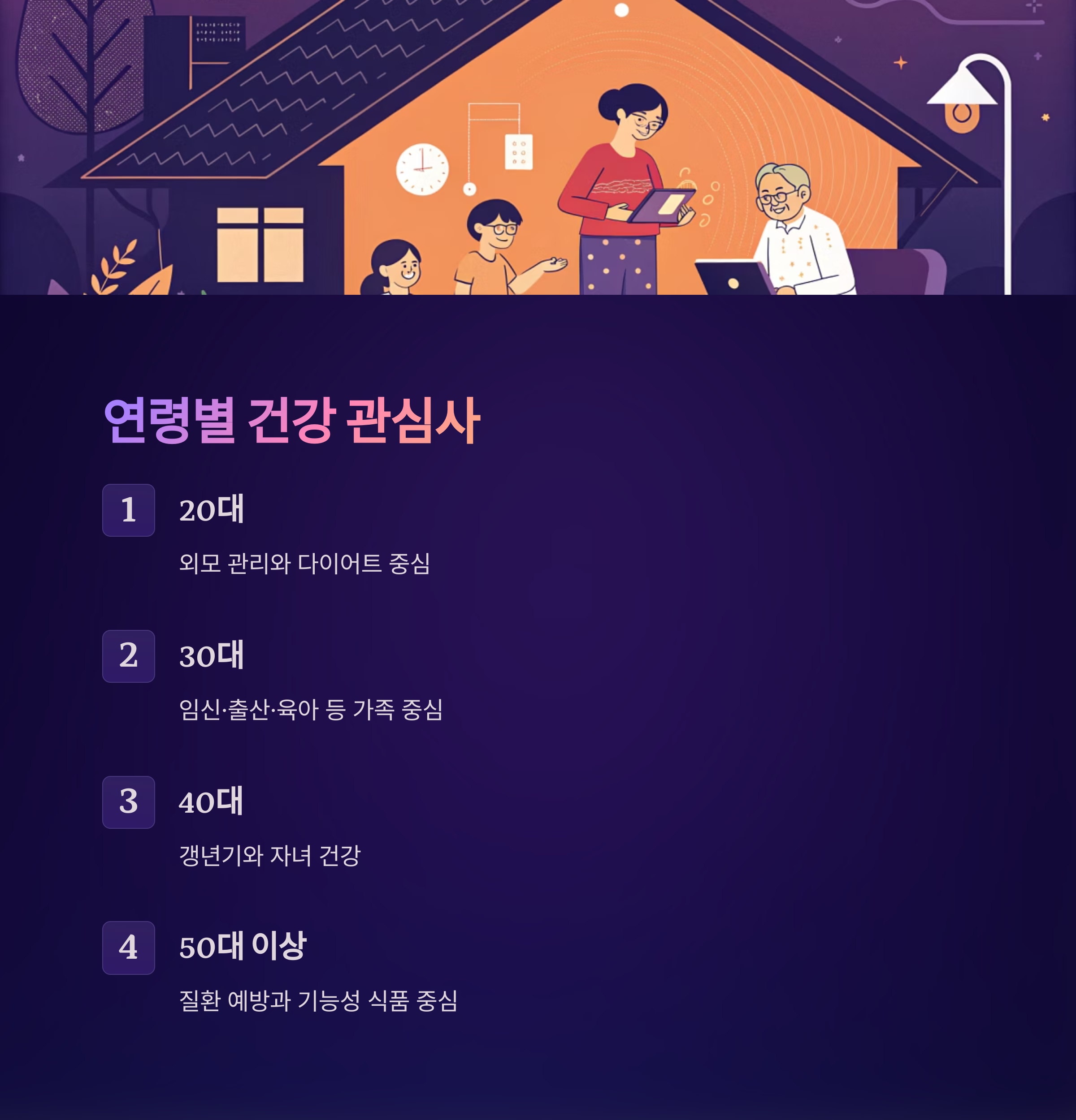 50대 이상은 질환 예방과 기능성 식품 중심으로 변화합니다.