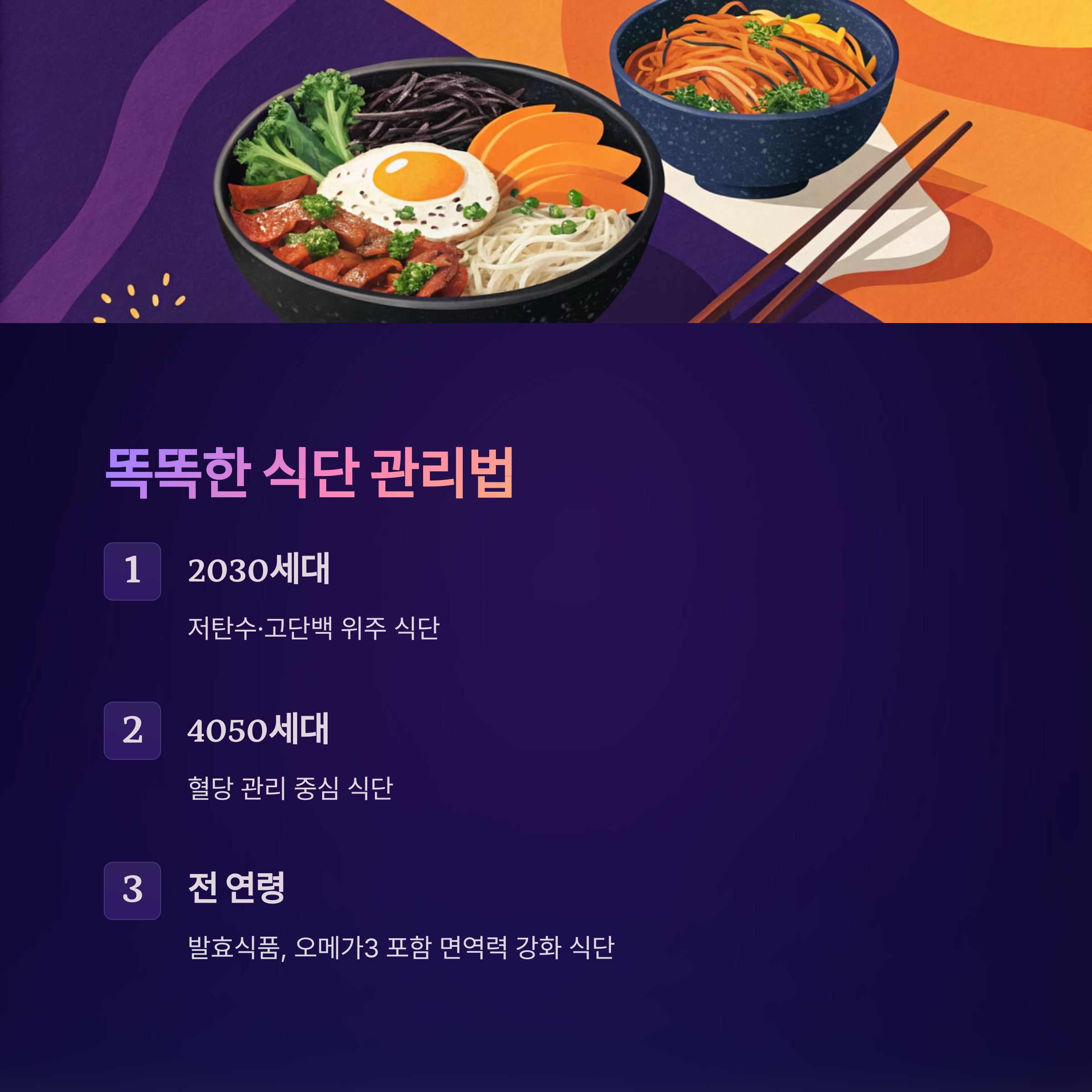 2030대는 저탄수·고단백 위주로,50대는 혈당 관리 중심의 식단이 필요합니다.
