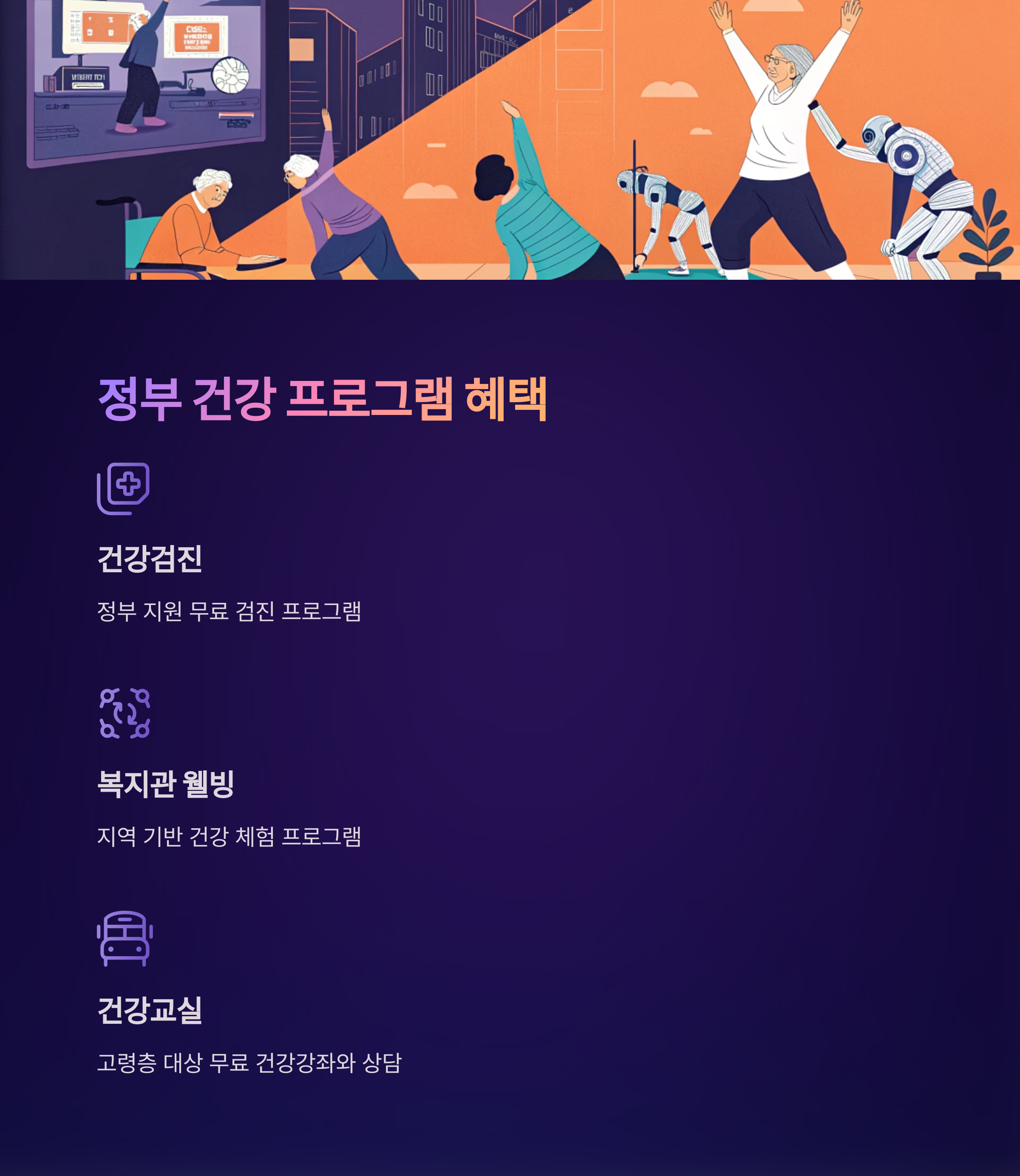 건강검진, 복지관 웰빙 체험, 건강교실 등은 모두 정부 지원을 받을 수 있습니다.