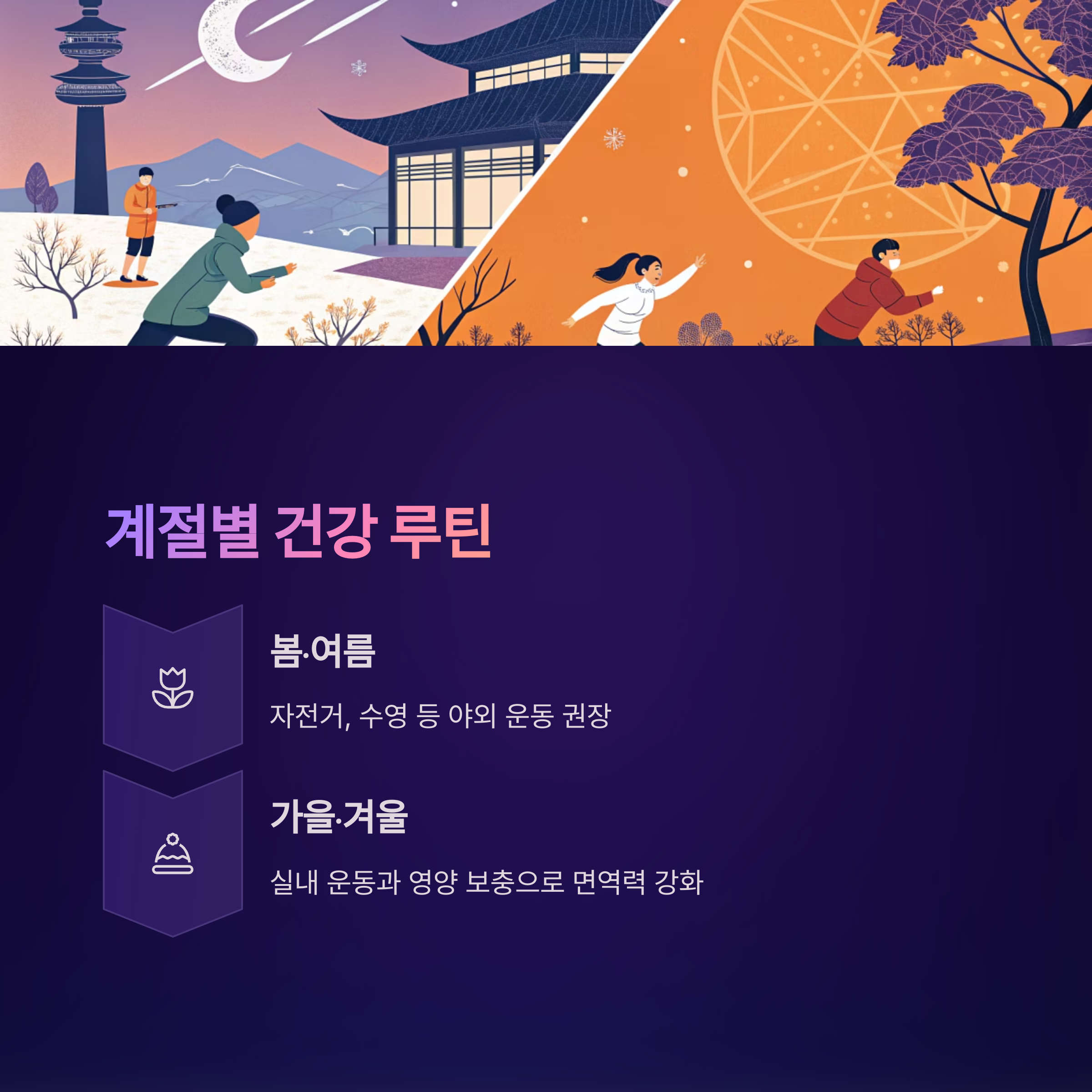 가을·겨울은 면역력이 떨어지기 쉬우므로 실내 운동과 영양 보충이 중요합니다.