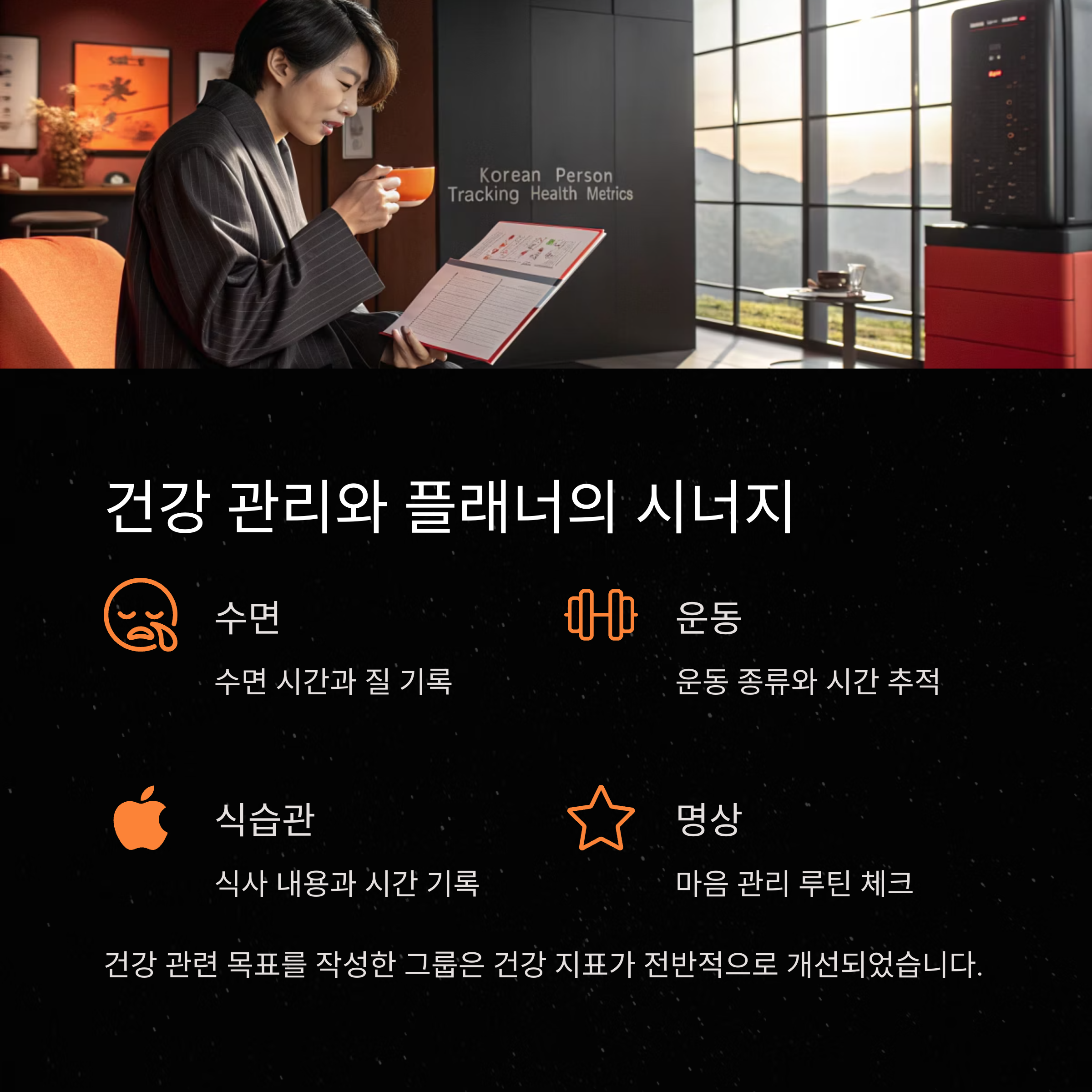수면, 운동, 식습관, 명상 등의 웰빙 목표까지 기록하면 효과는 배가됩니다