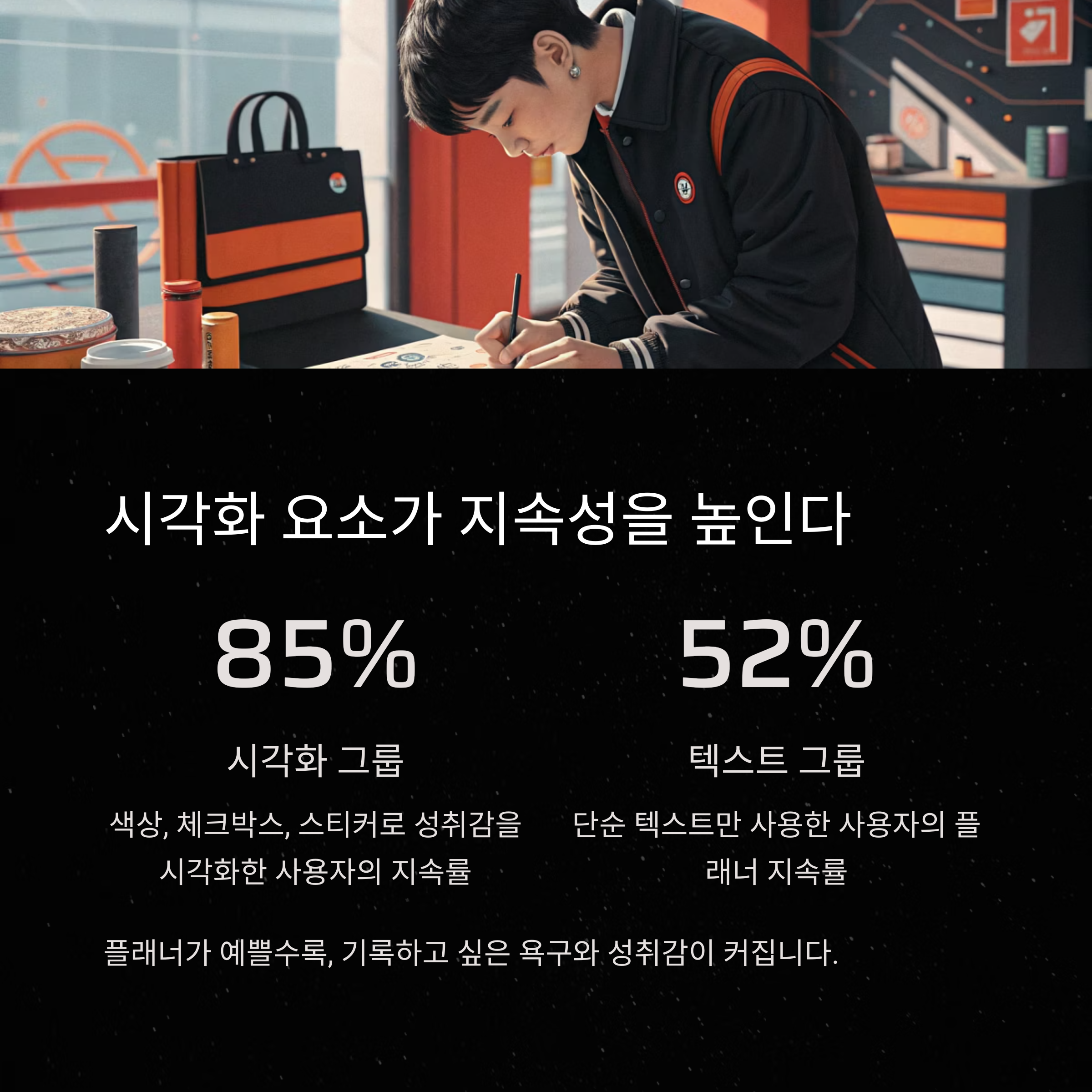 **색상, 체크박스, 스티커로 성취감을 시각화한 사람의 플래너 사용 지속률은 85%**였습니다