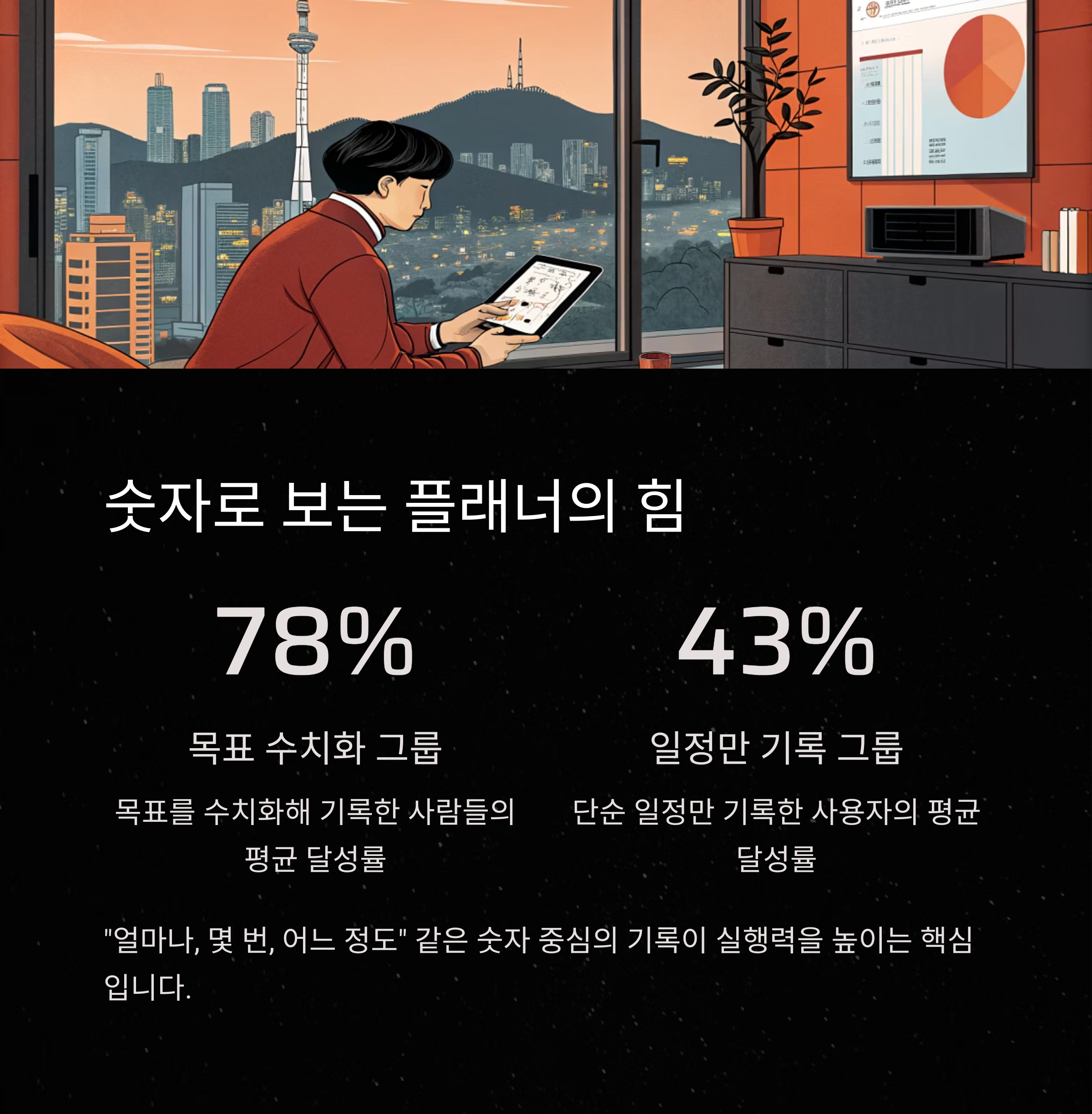 반면, 일정만 기록한 사용자의 달성률은 43%에 불과했습니다