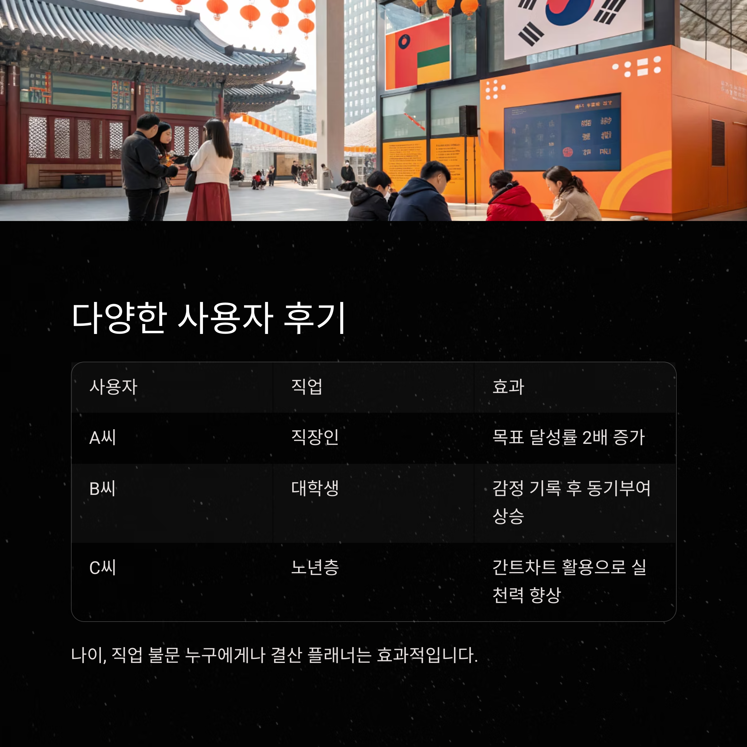 | A씨 | 직장인 | 목표 달성률 2배 증가 |