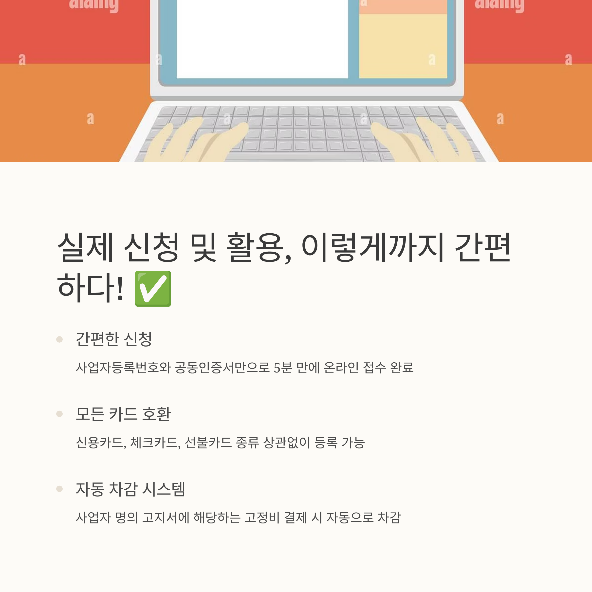 - 전기, 수도, 통신, 4대 보험료 등 사업자 명의 고지서에 해당하는 고정비가 결제될 때 크레딧이 먼저 자동으로 차감됩니다. 예를 들어 10만 원의 전기요금이 발생하면, 다음 달 카드 명세서에는 10만 원이 깎여서 나온다는 실질적인 절감 체감을 바로 할 수 있어요. 이건 진짜 경험해 봐야 안다니까요!
