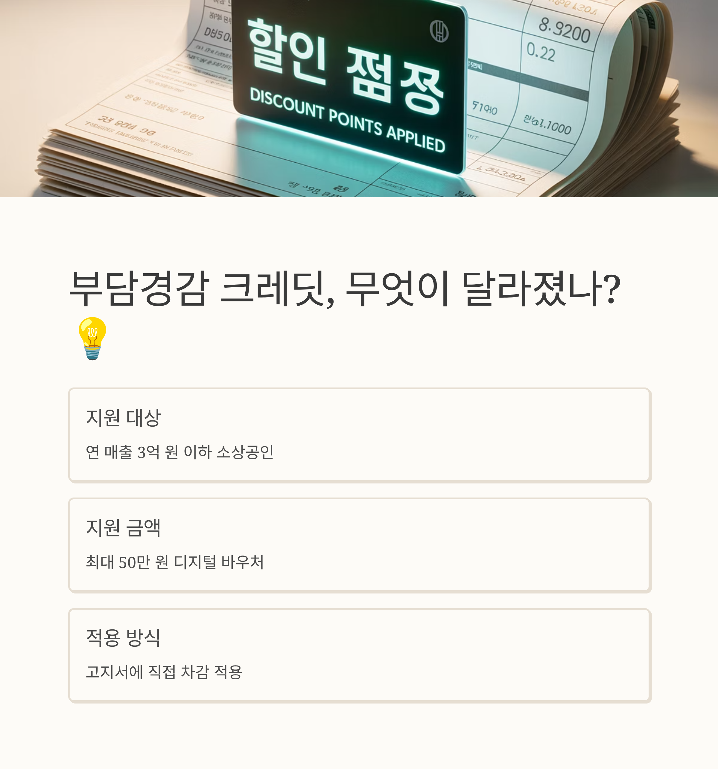부담경감 크레딧은 2025년 7월 14일 이후 시행되었으며, 연 매출 3억 원 이하 소상공인에게 최대 50만 원까지 공공요금 및 4대 보험료를 디지털 바우처 형태로 지원합니다. 특히, 고지서에서 직접 차감되는 방식이라 연체 위험을 줄이는 데 큰 도움이 됩니다.