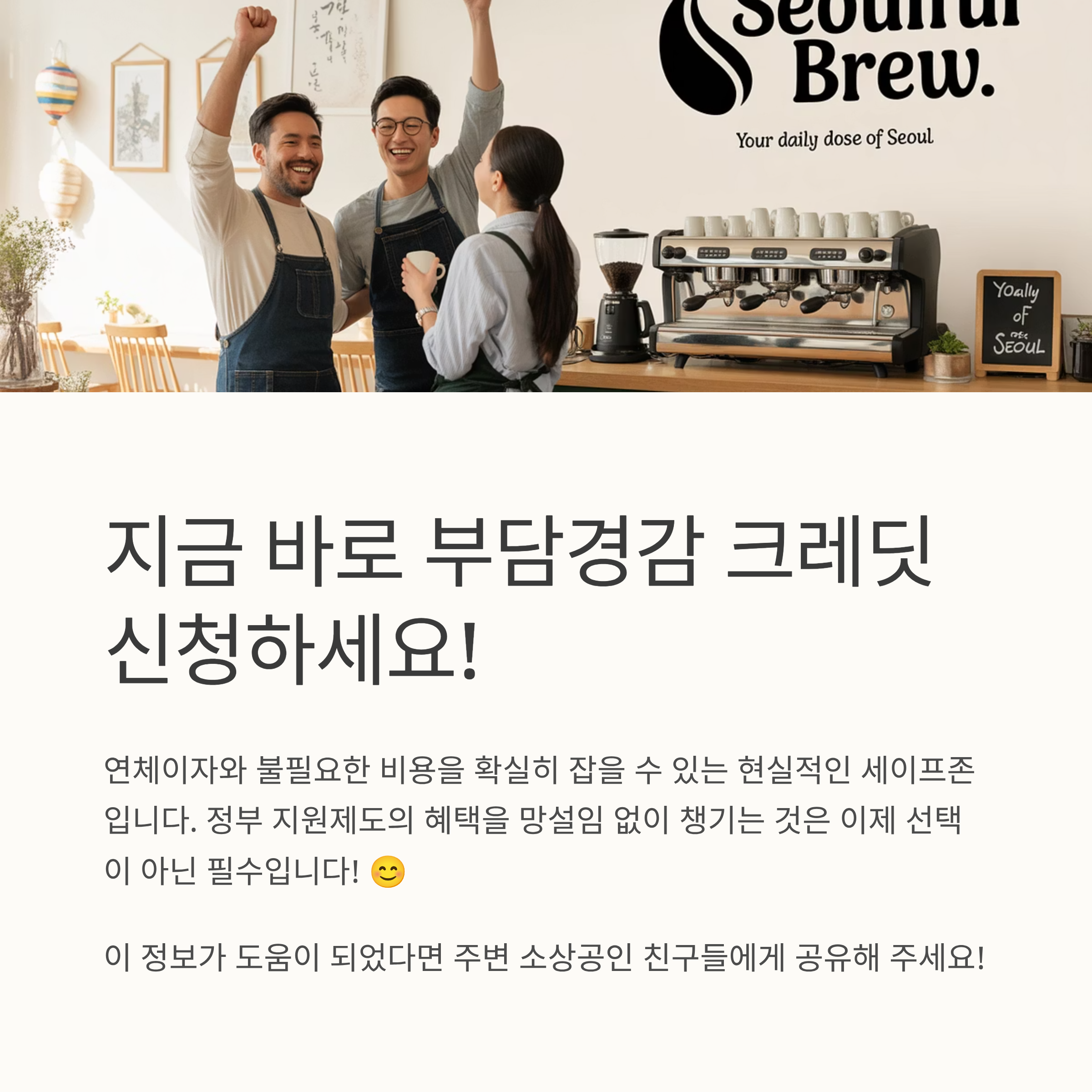 솔직히 말해서, 소상공인으로 사업을 운영하다 보면 매달 나가는 고정비 부담이 정말 크잖아요. 전기요금, 가스비, 4대 보험료... 월말만 되면 이 돈은 또 어떻게 메꾸나 싶어서 잠 못 이루는 밤이 저만 있는 건 아닐 거예요. 그런데 말이죠, 2025년부터 아주 반가운 소식이 들려왔습니다. 바로 ‘부담경감 크레딧’ 제도인데요. 이게 뭐랄까, 단순히 지원해 주는 걸 넘어서서 연체이자 걱정까지 덜어준다는 거예요! 제 주변 소상공인분들도 이거 덕분에 한숨 돌렸다는 이야기가 많이 들리더라고요. 😊