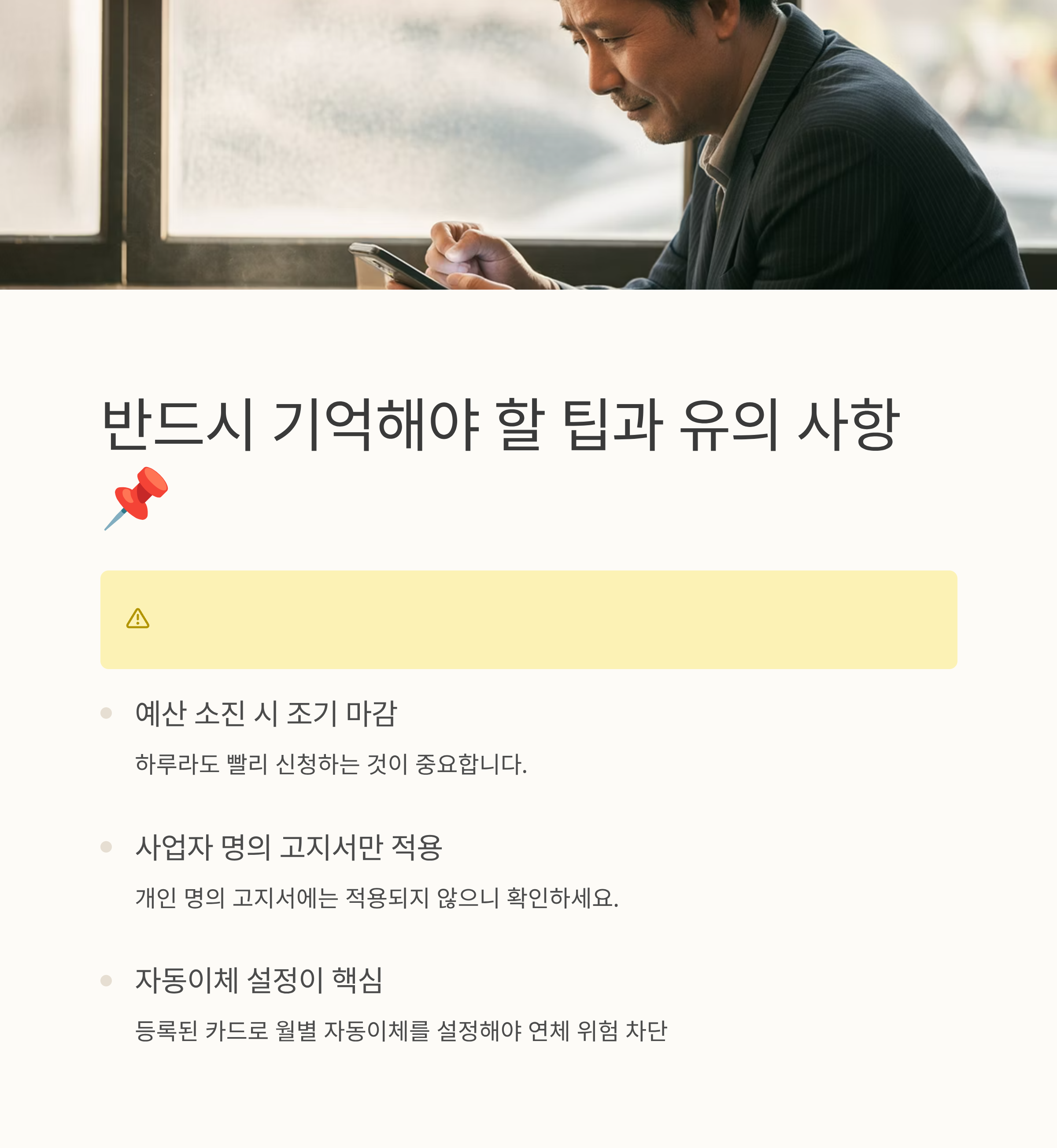 부담경감 크레딧은 예산 소진 시 조기 마감될 수 있으며, 사업자 명의 고지서에만 적용됩니다. 또한, 등록된 카드로 월별 자동이체를 설정해야 연체 위험을 효과적으로 차단할 수 있습니다.