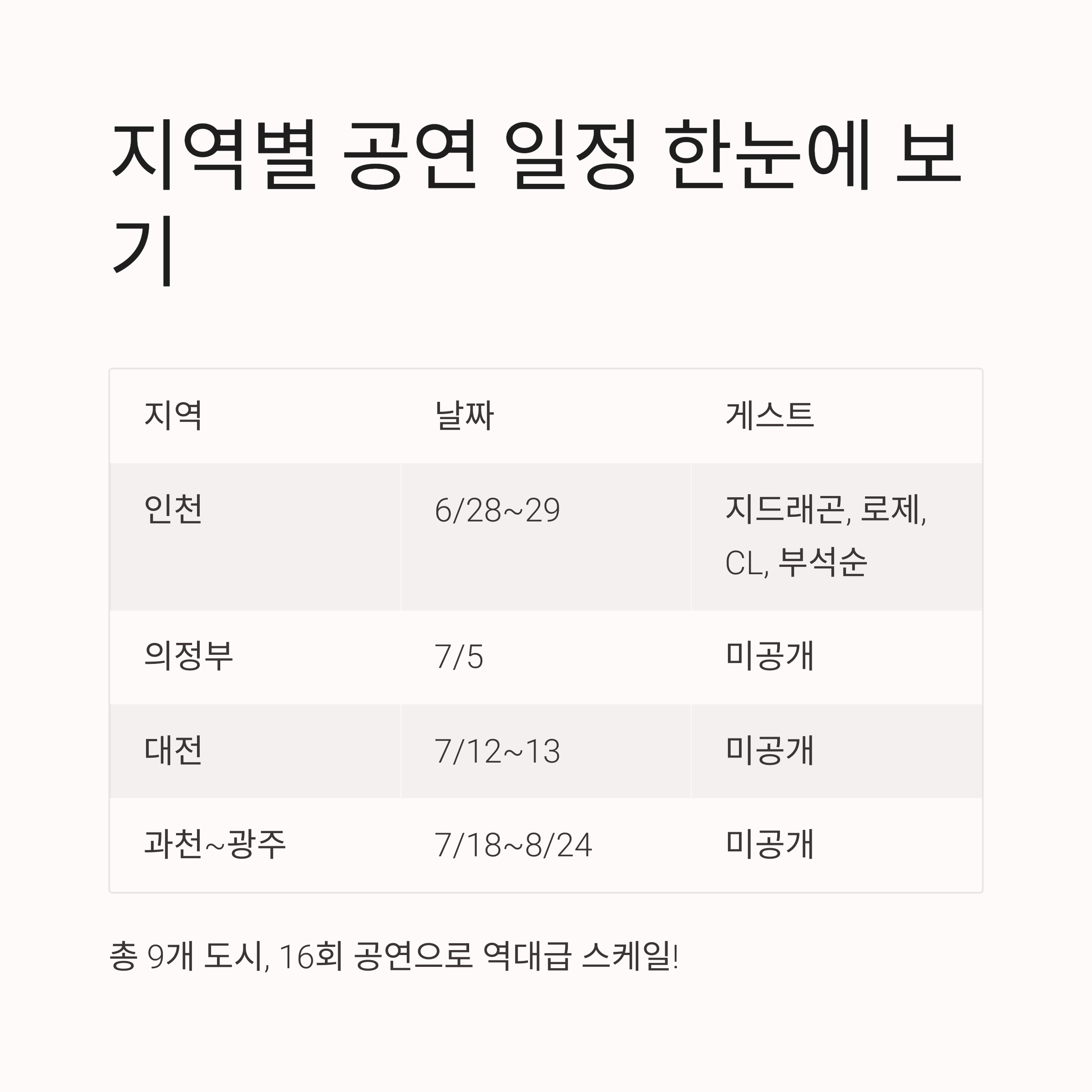 지역별 공연 일정 및 게스트 라인업 한눈에 보기