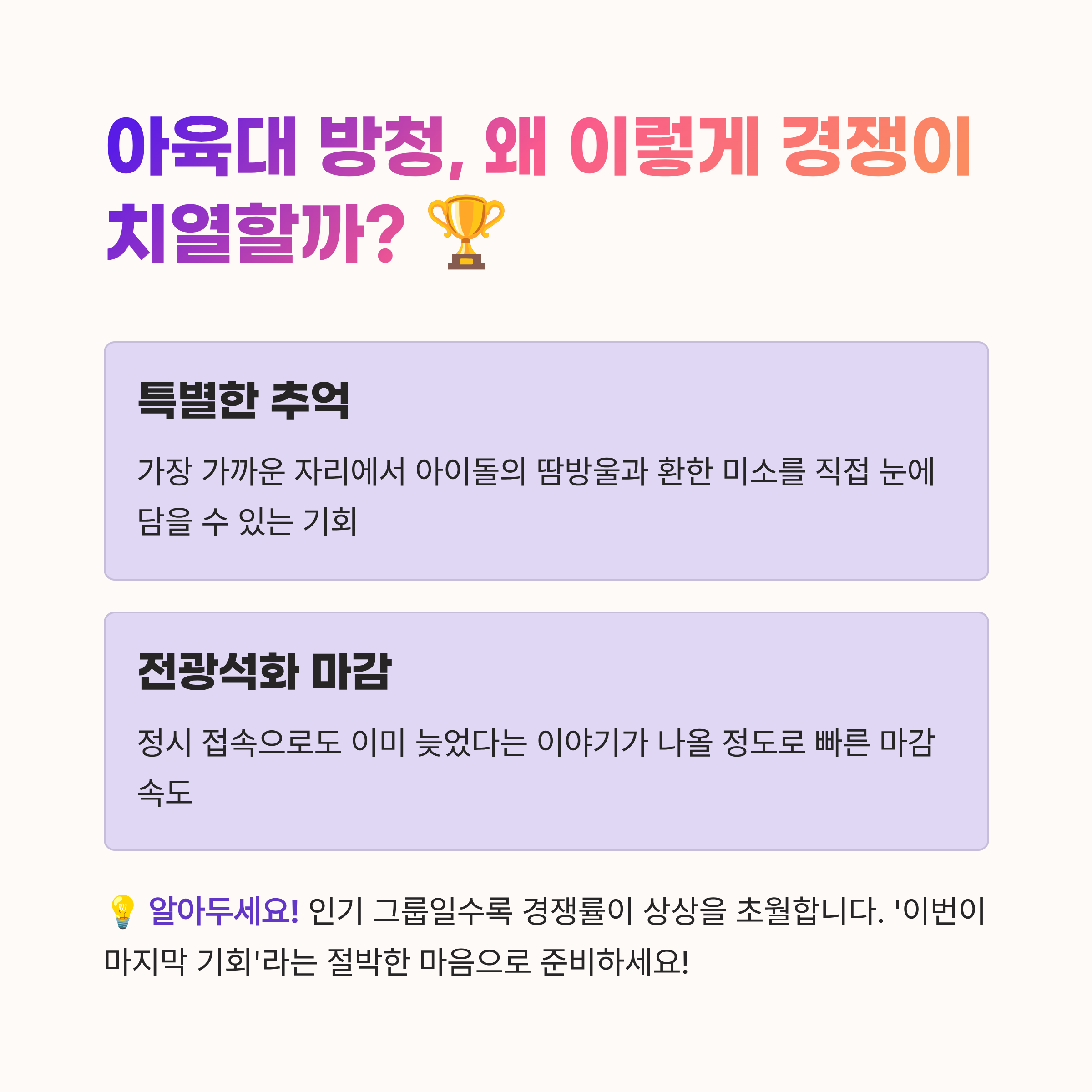 - 경쟁률: 공식 수치는 없지만, 인기 그룹은 초단위 마감! '광클'은 기본