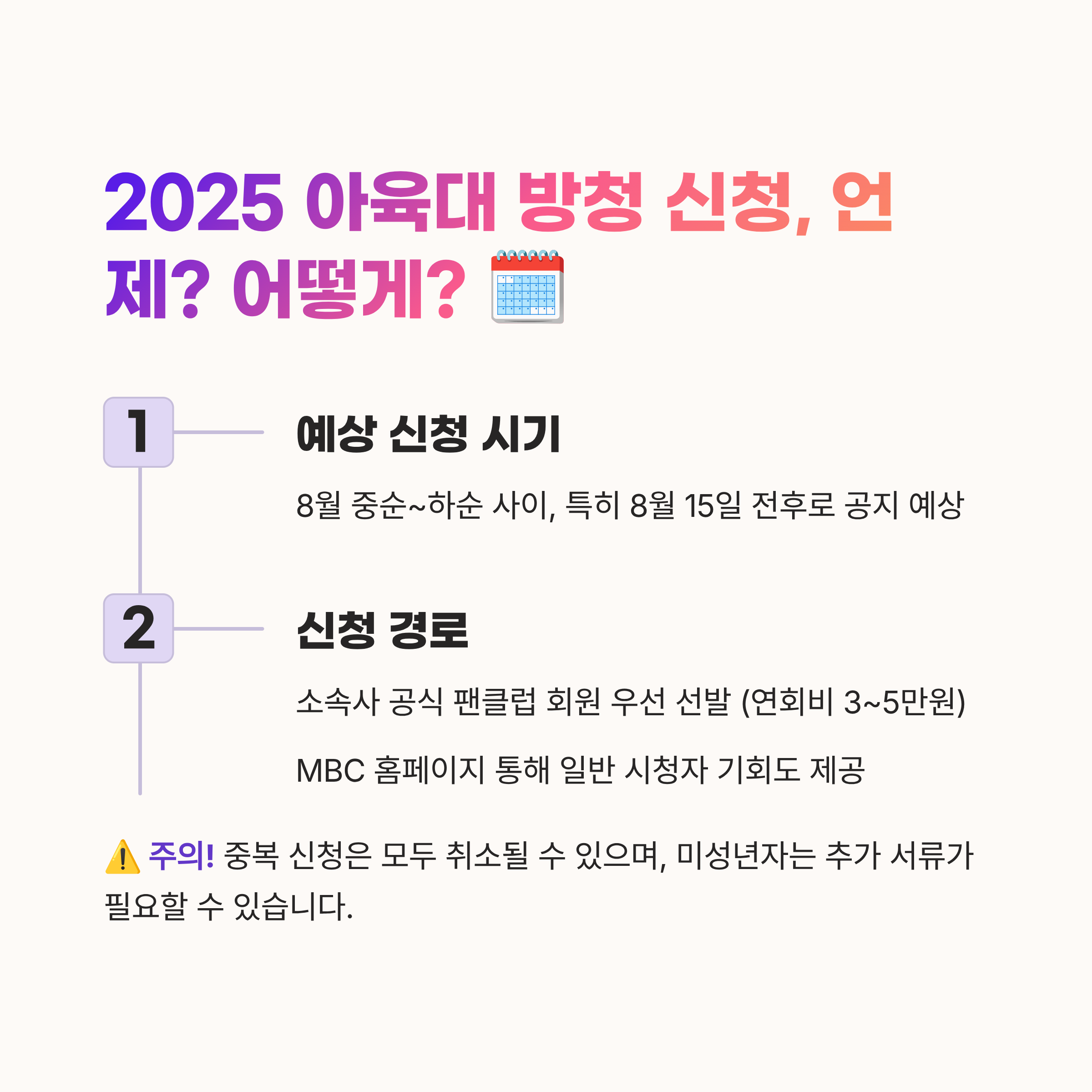 가장 궁금해하실 방청 신청 시기부터 알려드릴게요. 공식적인 공지는 아직 없지만, 최근 몇 년간의 패턴을 분석해 보면, 2025년 아육대 방청 신청은 8월 중순에서 하순 사이에 집중될 가능성이 높아요. 특히 8월 15일 전후로 각 소속사 팬클럽이나 MBC 공식 홈페이지에 공지가 올라올 수 있으니, 8월 초부터는 매일매일 공지사항을 확인하는 습관을 들이는 게 좋겠죠?